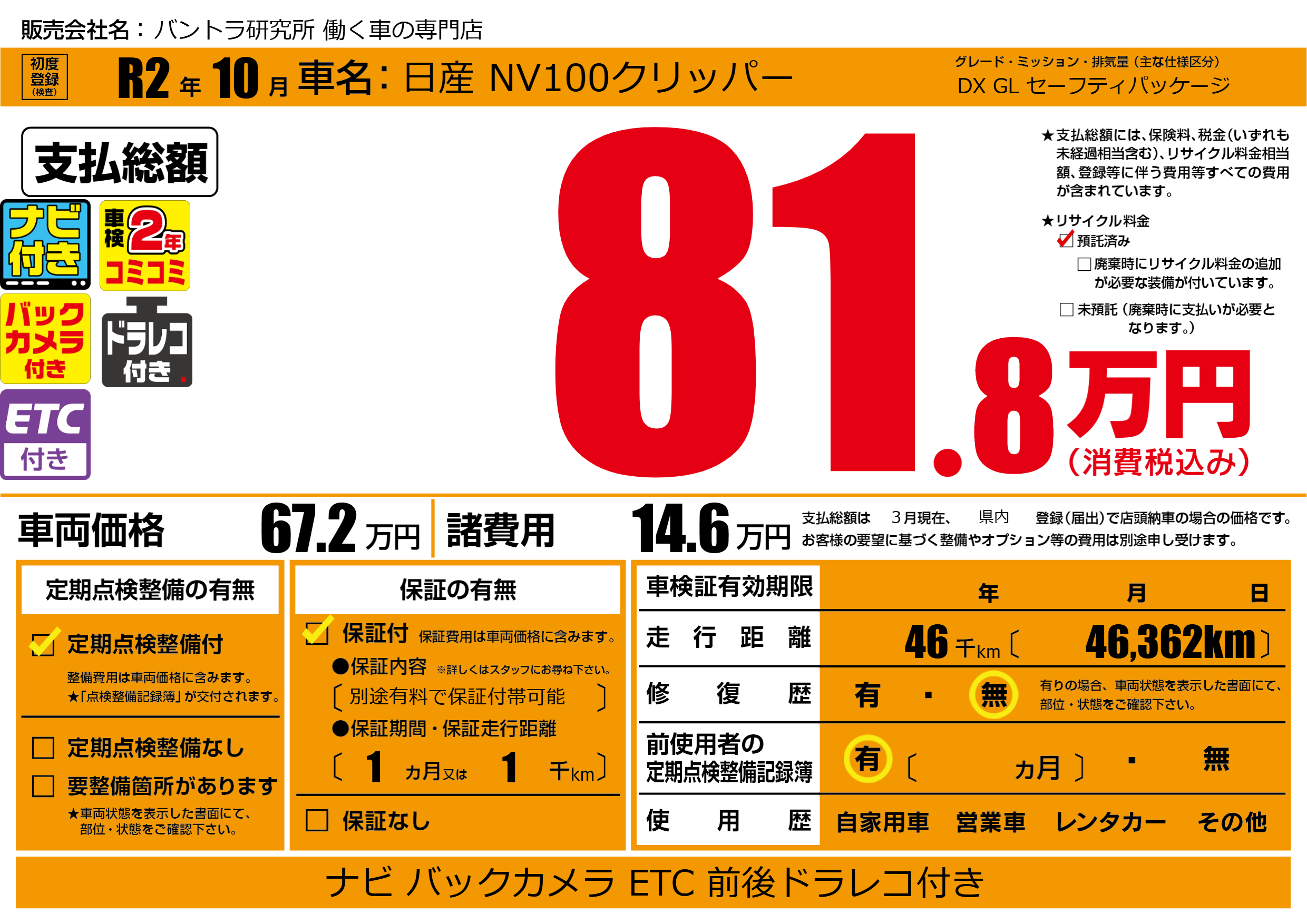 | 車名 | 日産 NV100クリッパー | グレード ミッション 排気量 |