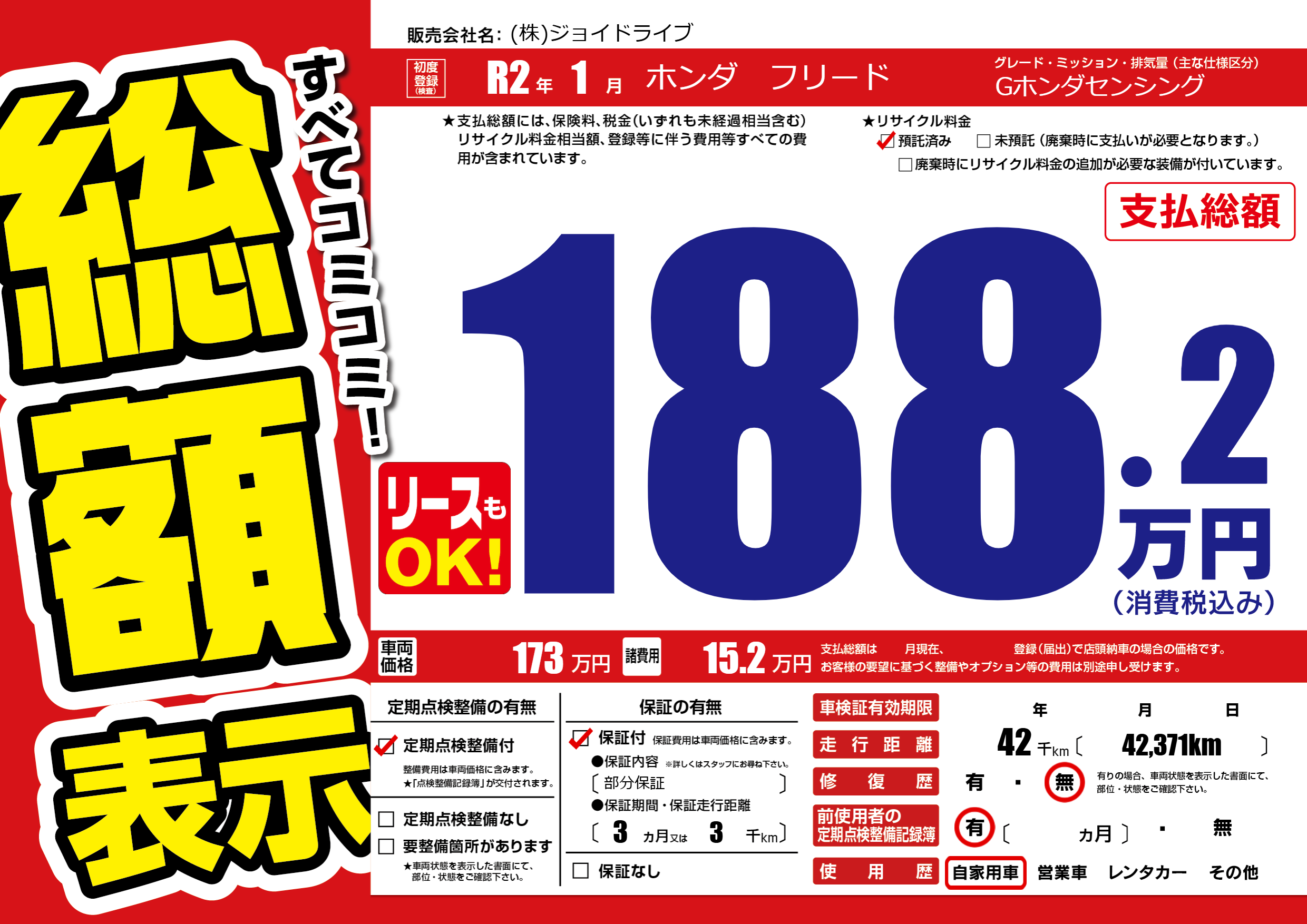 | 車名 | ホンダ フリード | グレード ミッション 排気量 |