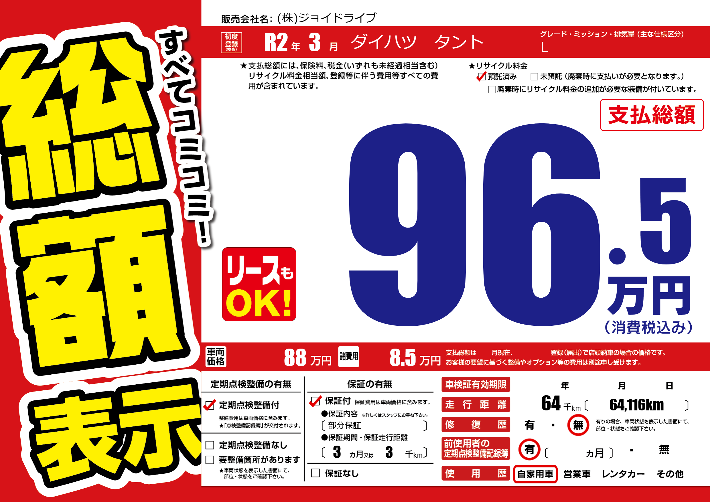 | 車名 | ダイハツ タント | グレード ミッション 排気量 |