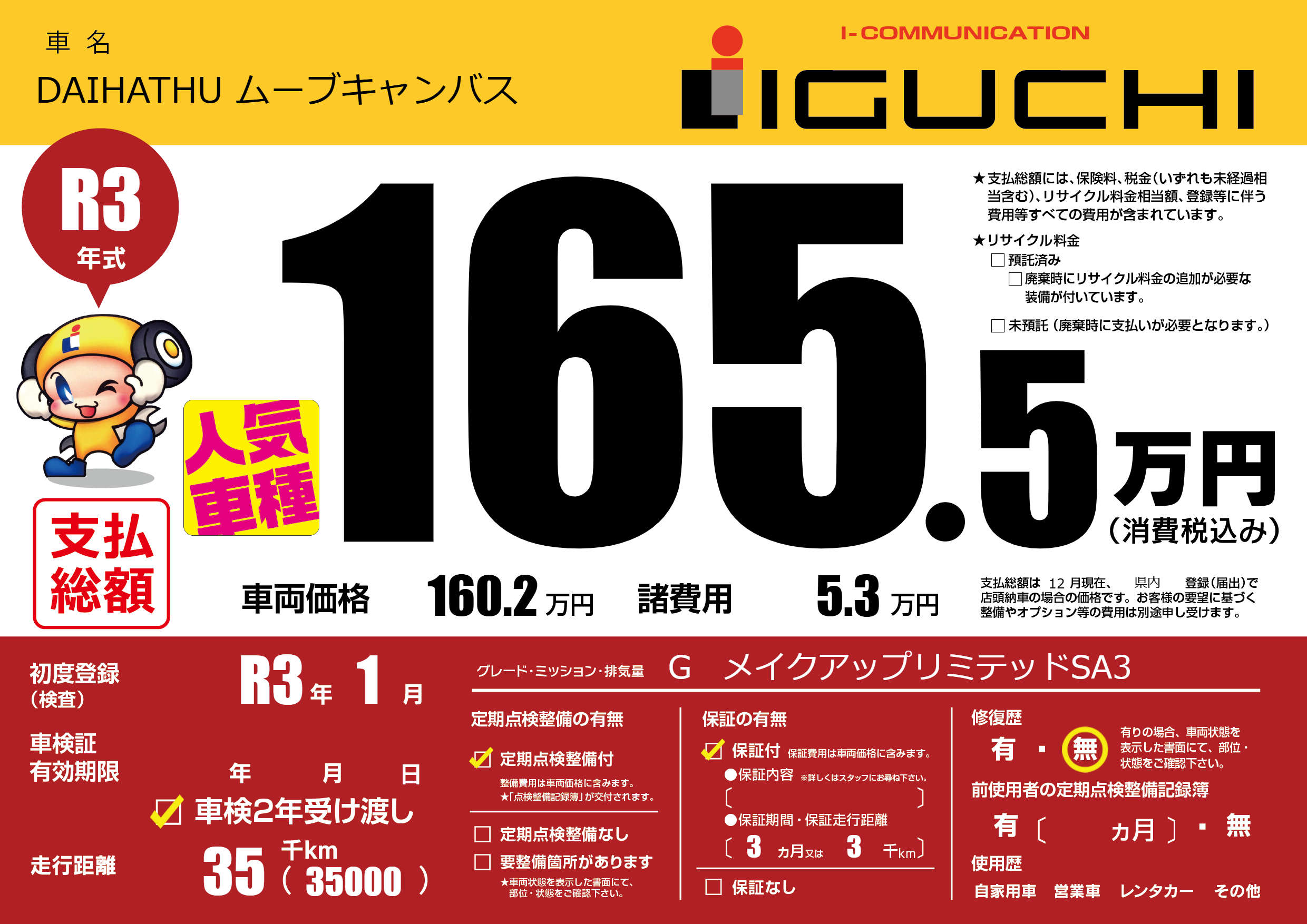 | 車名 | DAIHATHU ムーブキャンバス | グレード ミッション 排気量 |