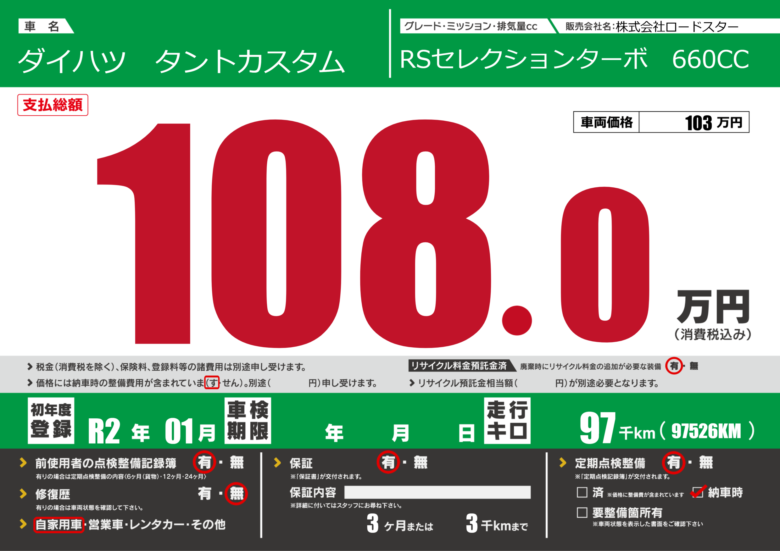 保証付き 保証内容(---) 3ヶ月または(3)千kmまで |