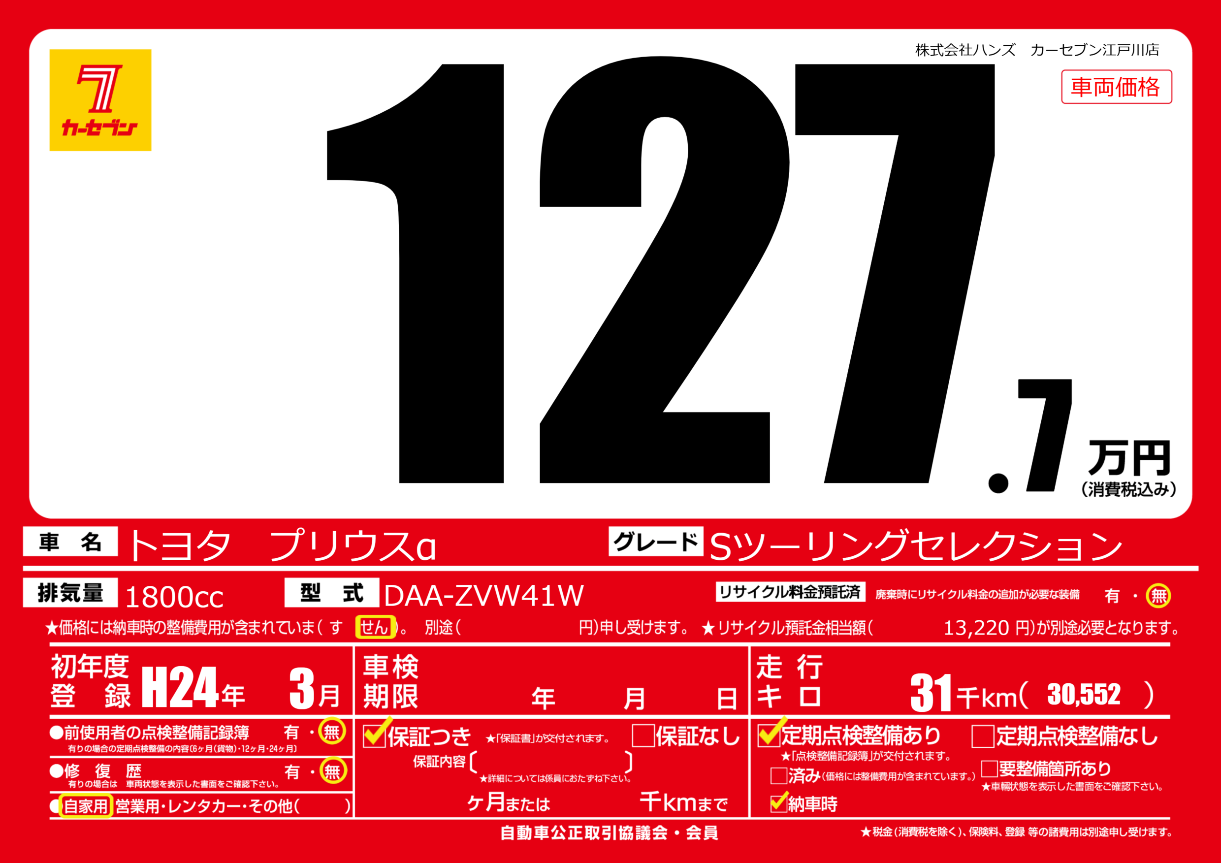 | 車名 | トヨタ プリウスα | グレード ミッション 排気量 |