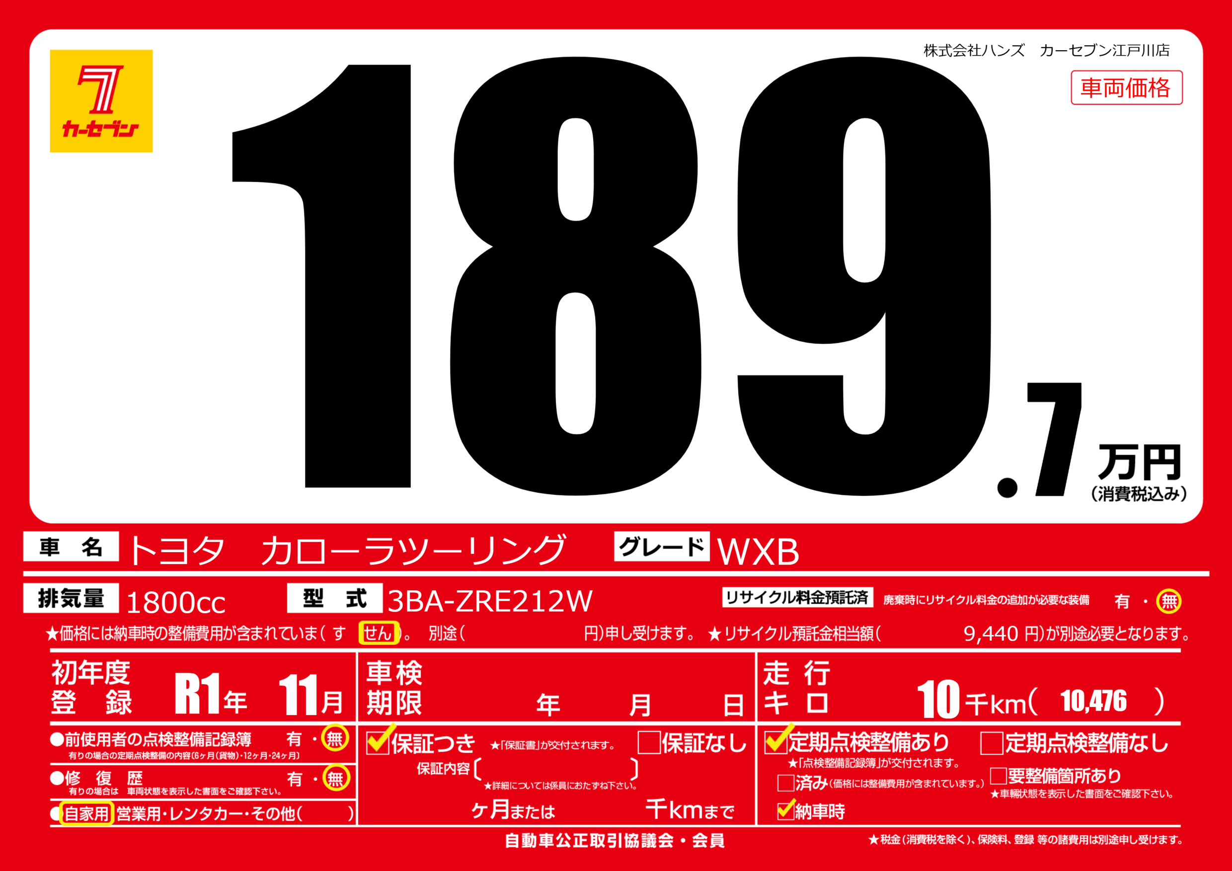 | 定期点検整備 | 定期点検整備あり 納車時あり | ||
