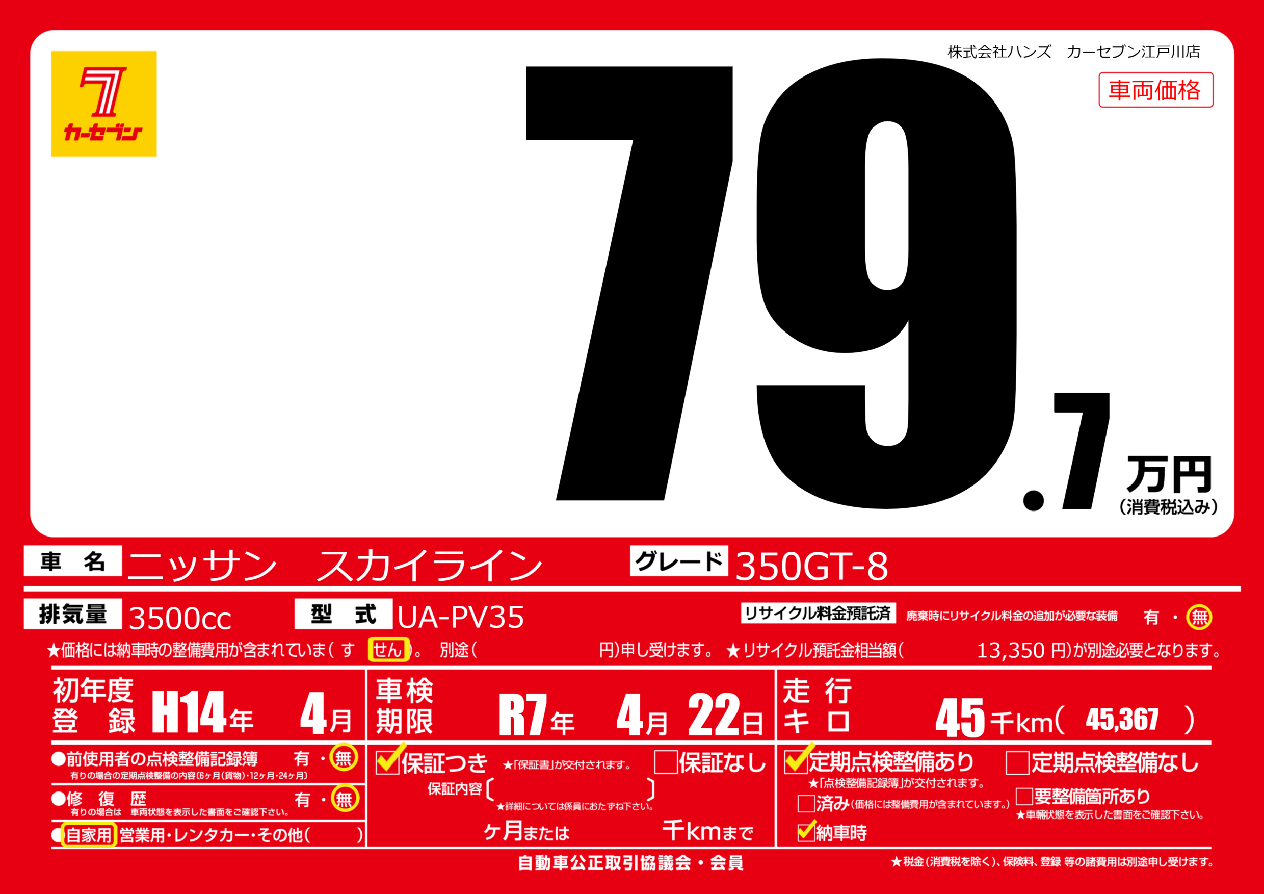| 車名 | ニッサン スカイライン | グレード ミッション 排気量 |