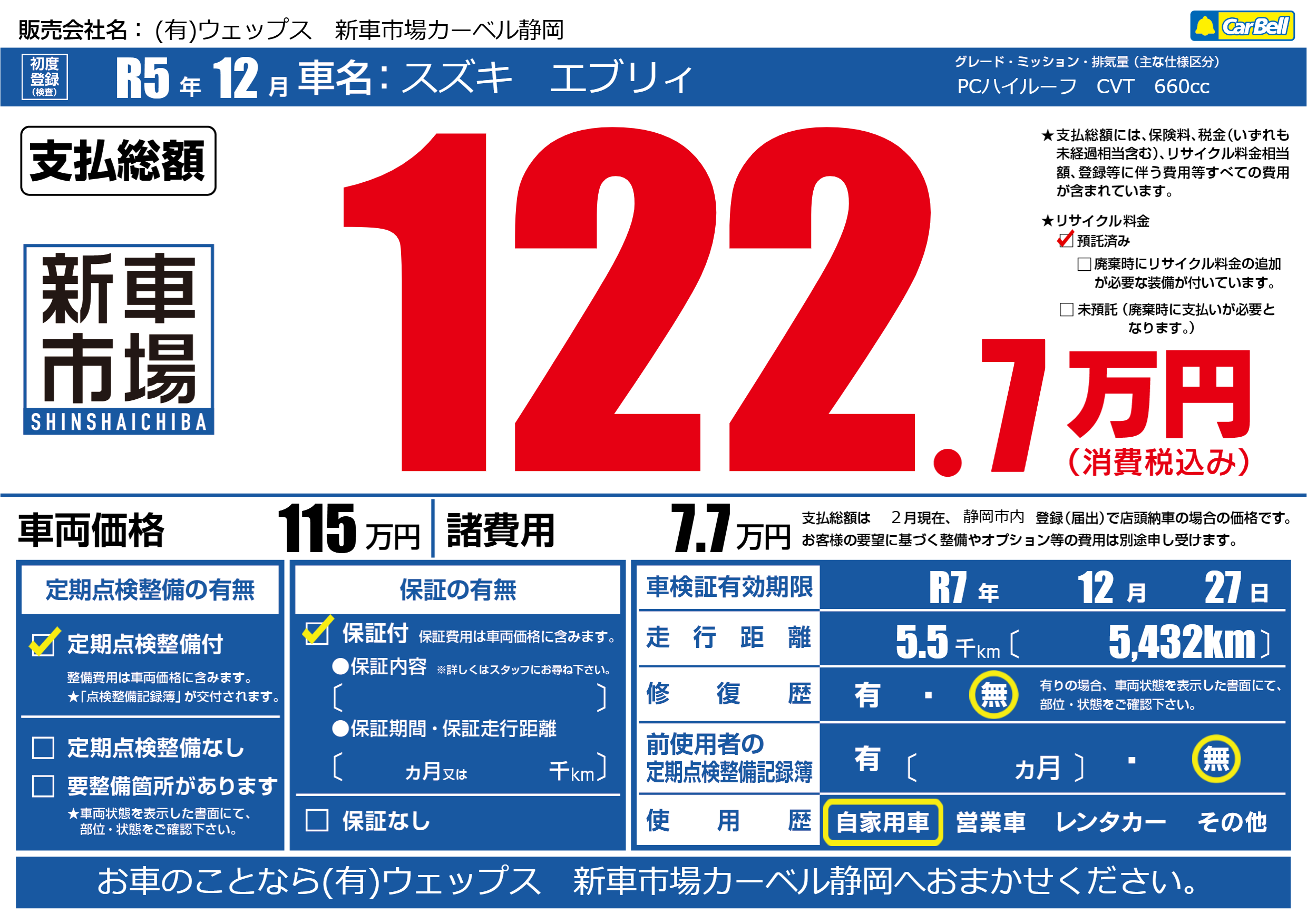 | 走行キロ | 0.5万km | 初年度登録 | R5年12月 |