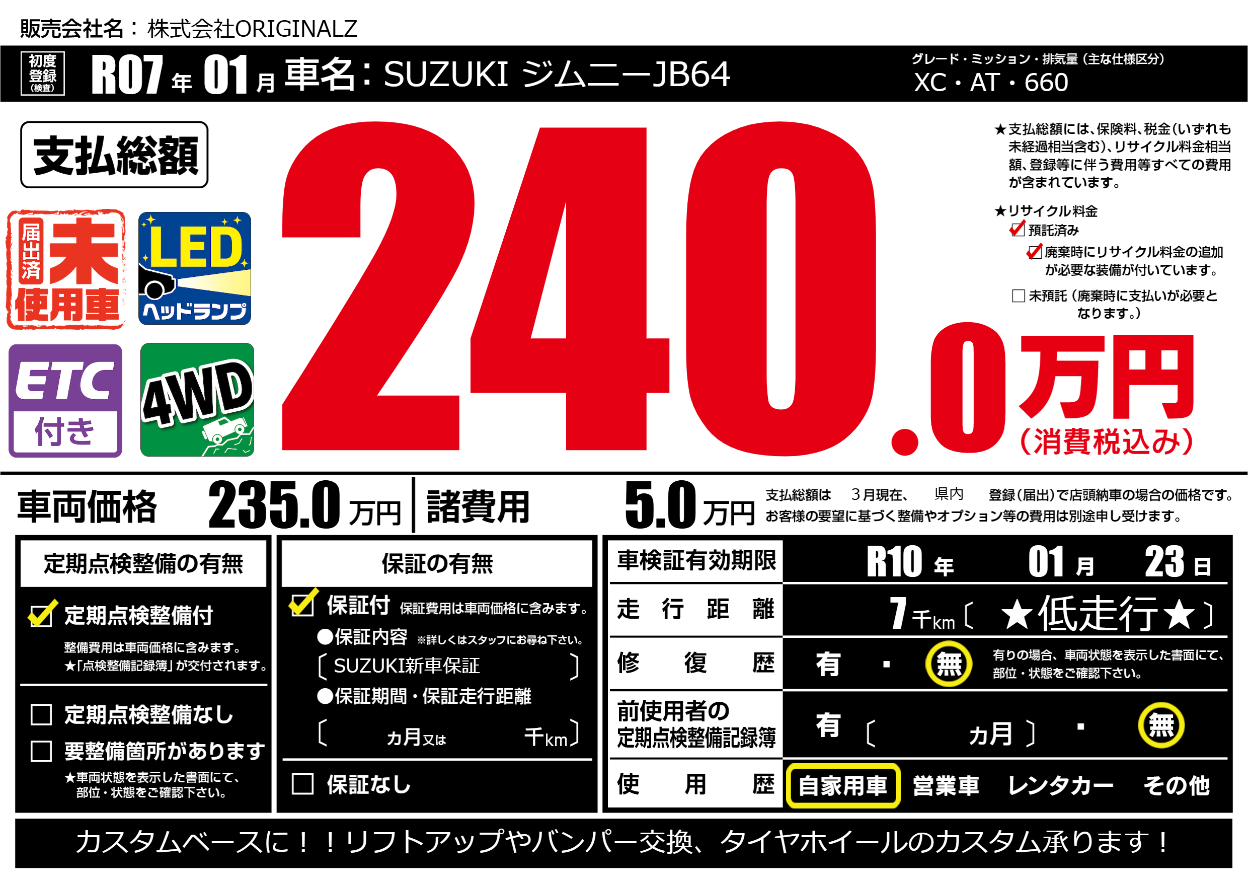 | 車名 | SUZUKI ジムニーJB64 | グレード ミッション 排気量 |