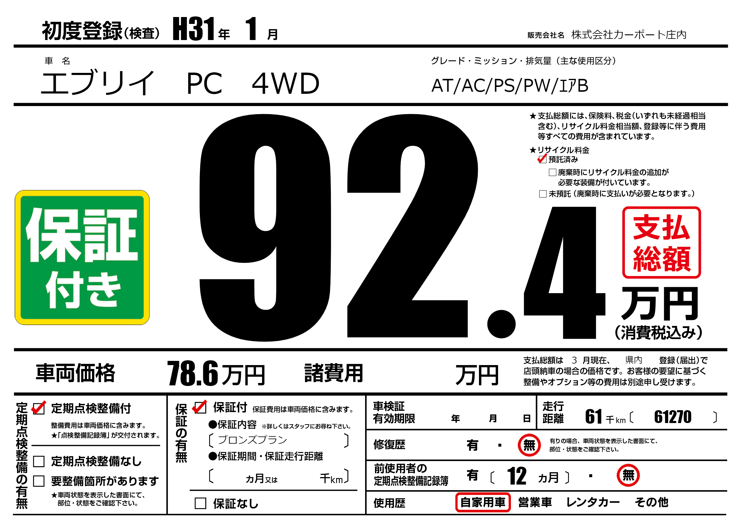 | 車名 | エブリイ PC 4WD | グレード ミッション 排気量 |