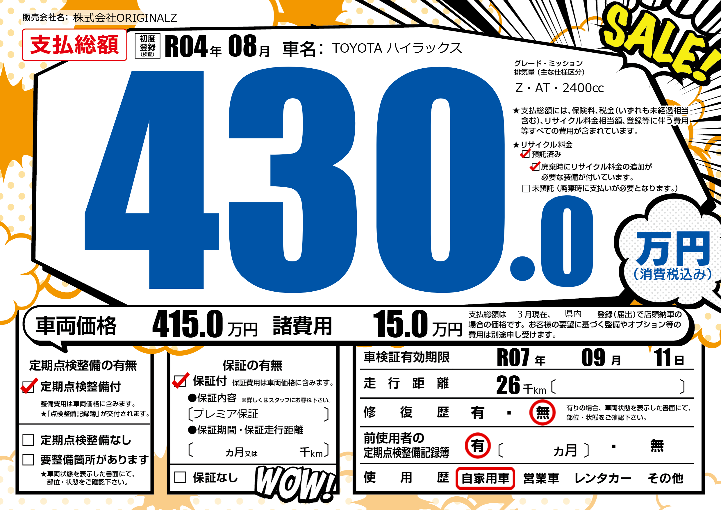 | 車名 | TOYOTA ハイラックス | グレード ミッション 排気量 |