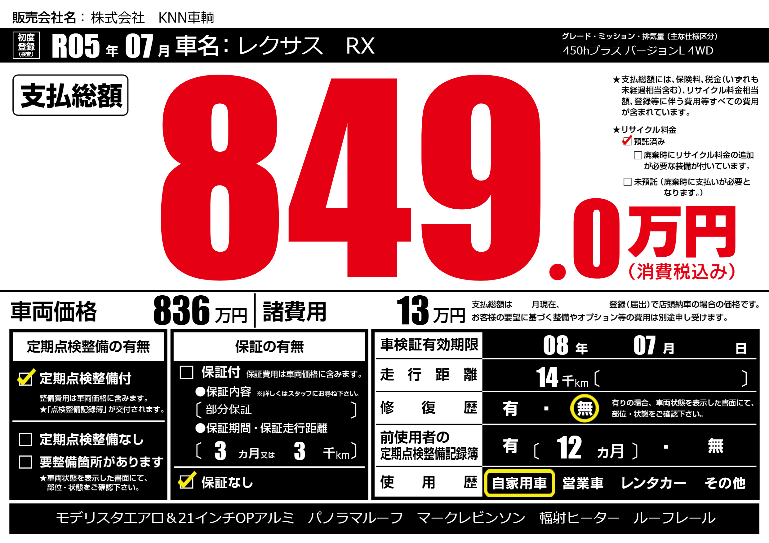 | 車名 | レクサス RX | グレード ミッション 排気量 |