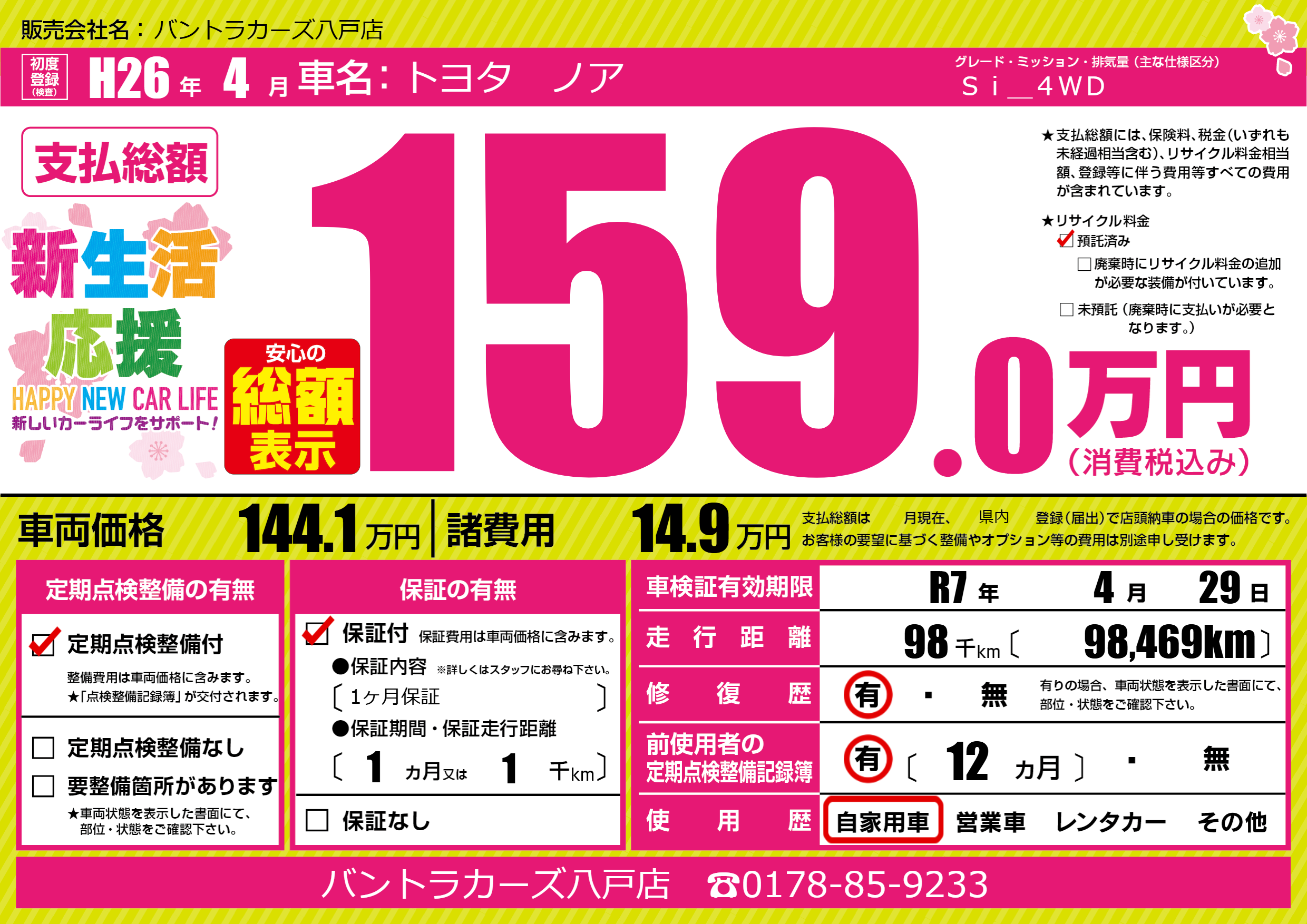 | 走行キロ | 9.8万km | 初年度登録 | H26年4月 |