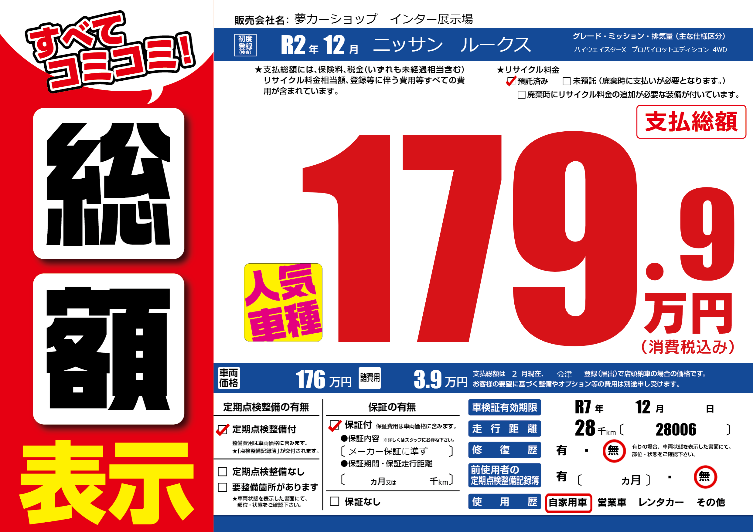 | 走行キロ | 2.8万km | 初年度登録 | R2年12月 |