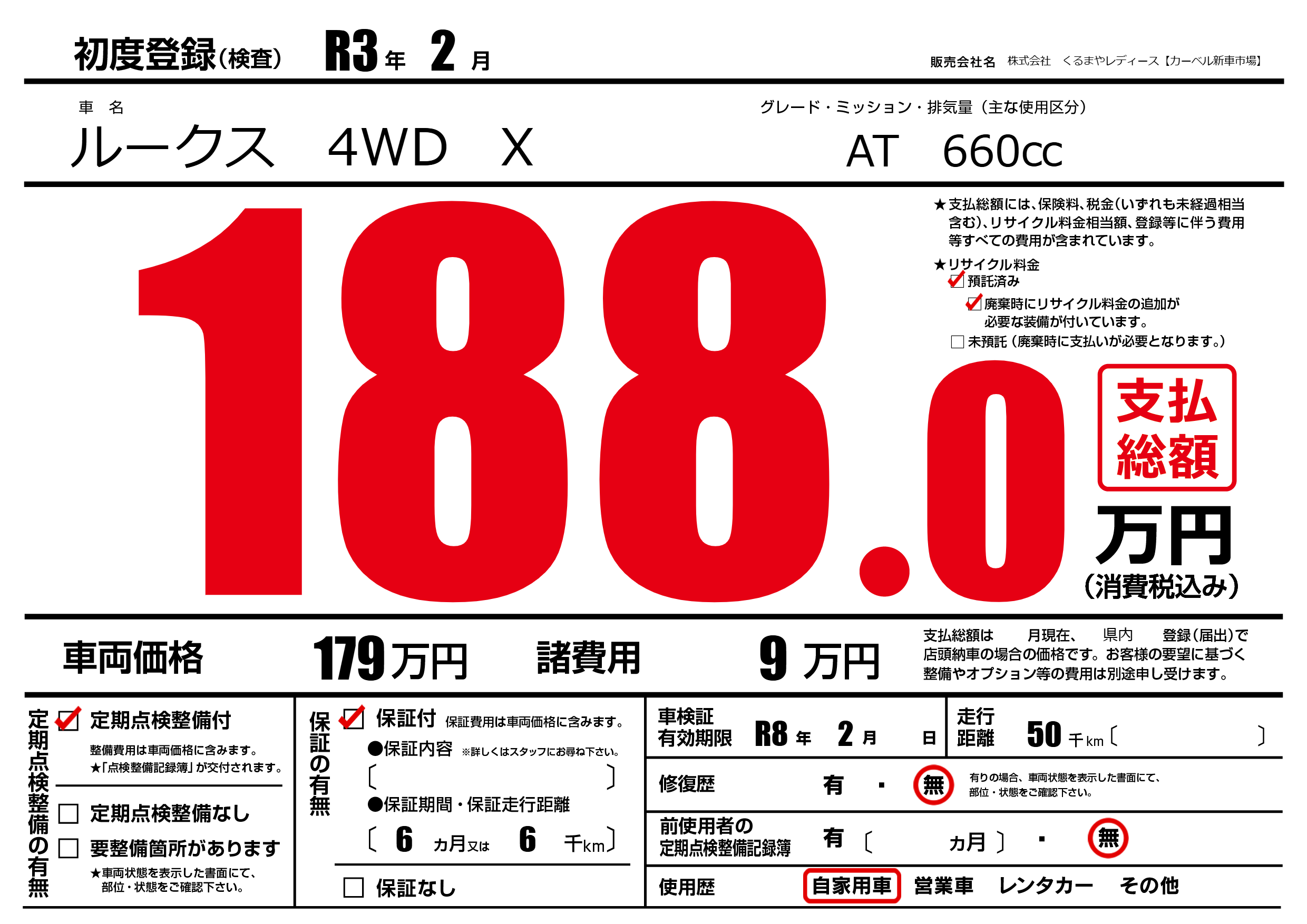 | 車検制限 | R8年 2月 - 日 | ||