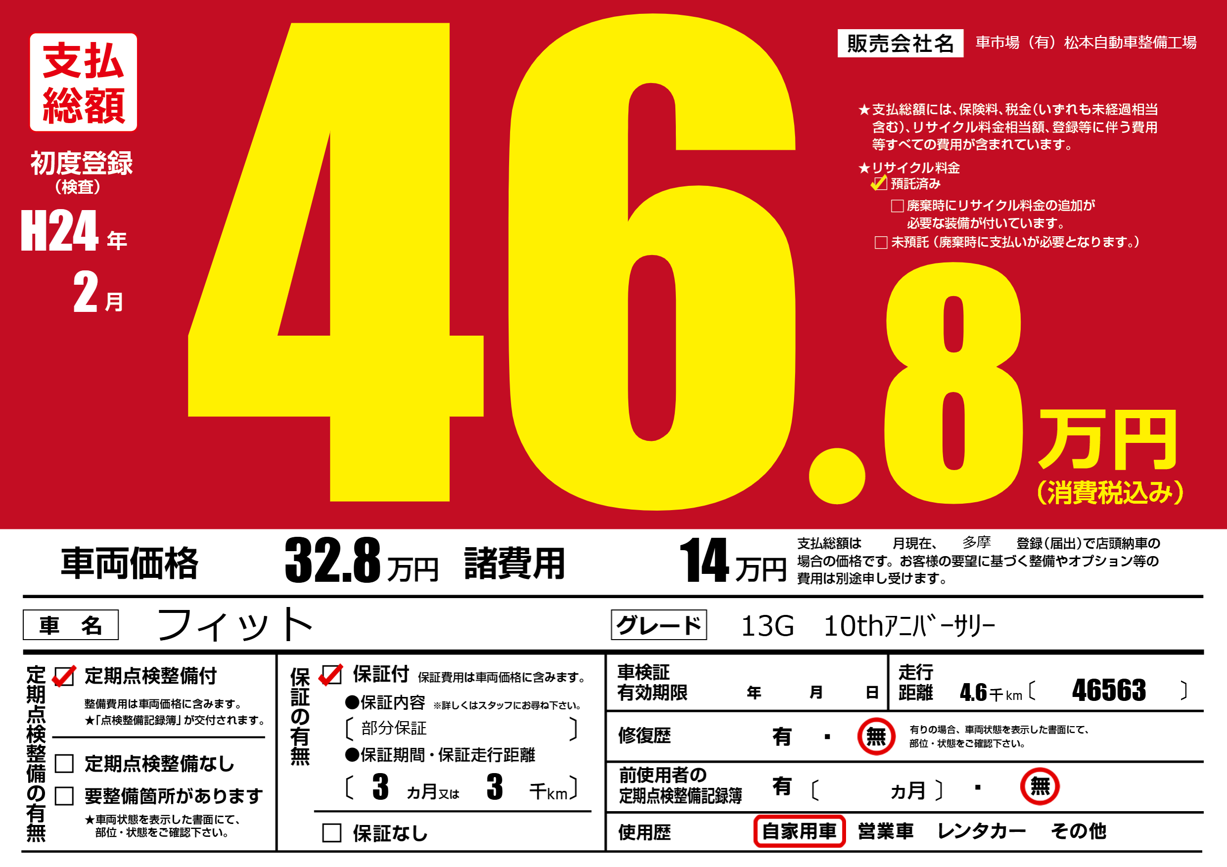 | 走行キロ | 0.4万km | 初年度登録 | H24年2月 |