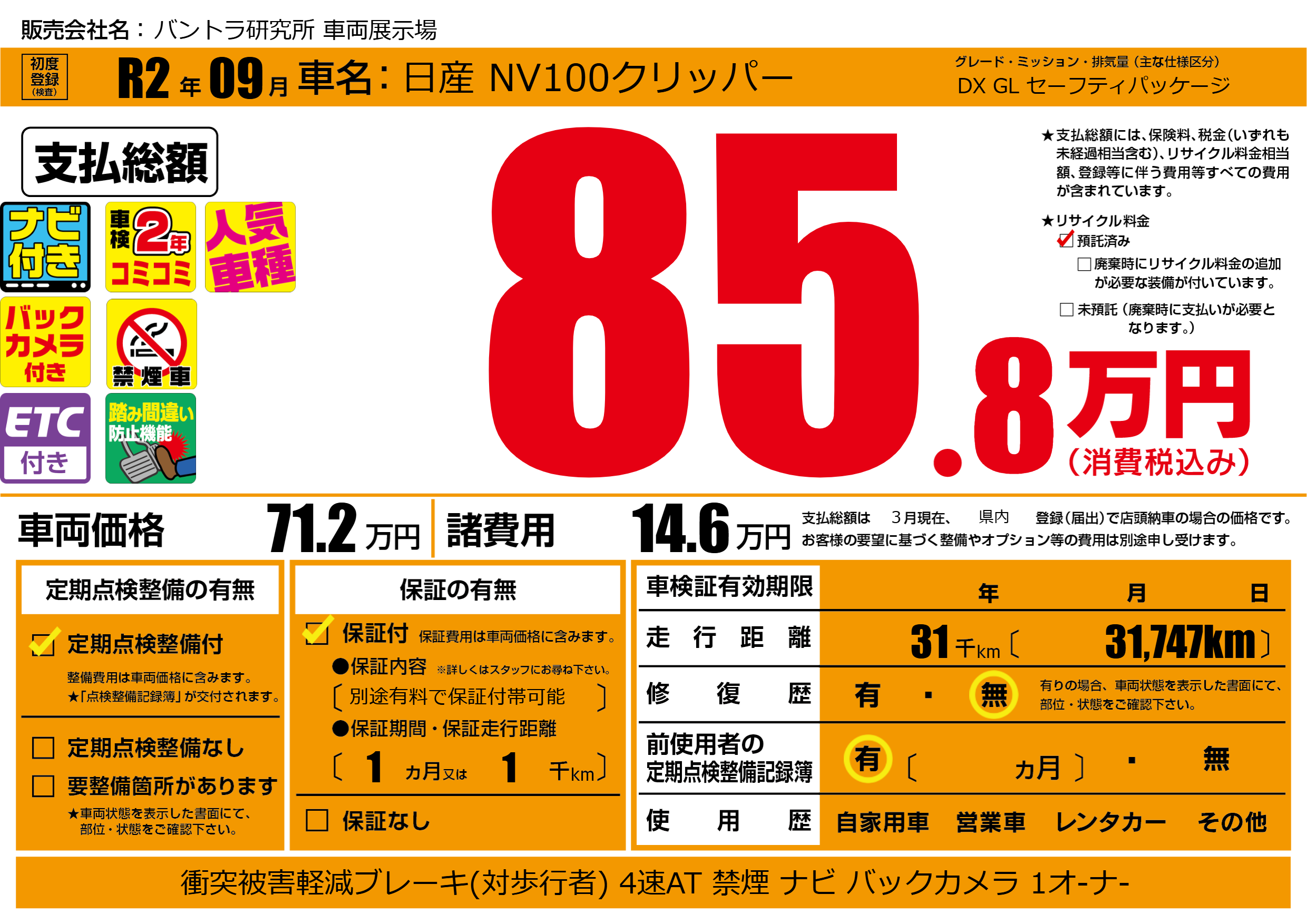 | 車名 | 日産 NV100クリッパー | グレード ミッション 排気量 |
