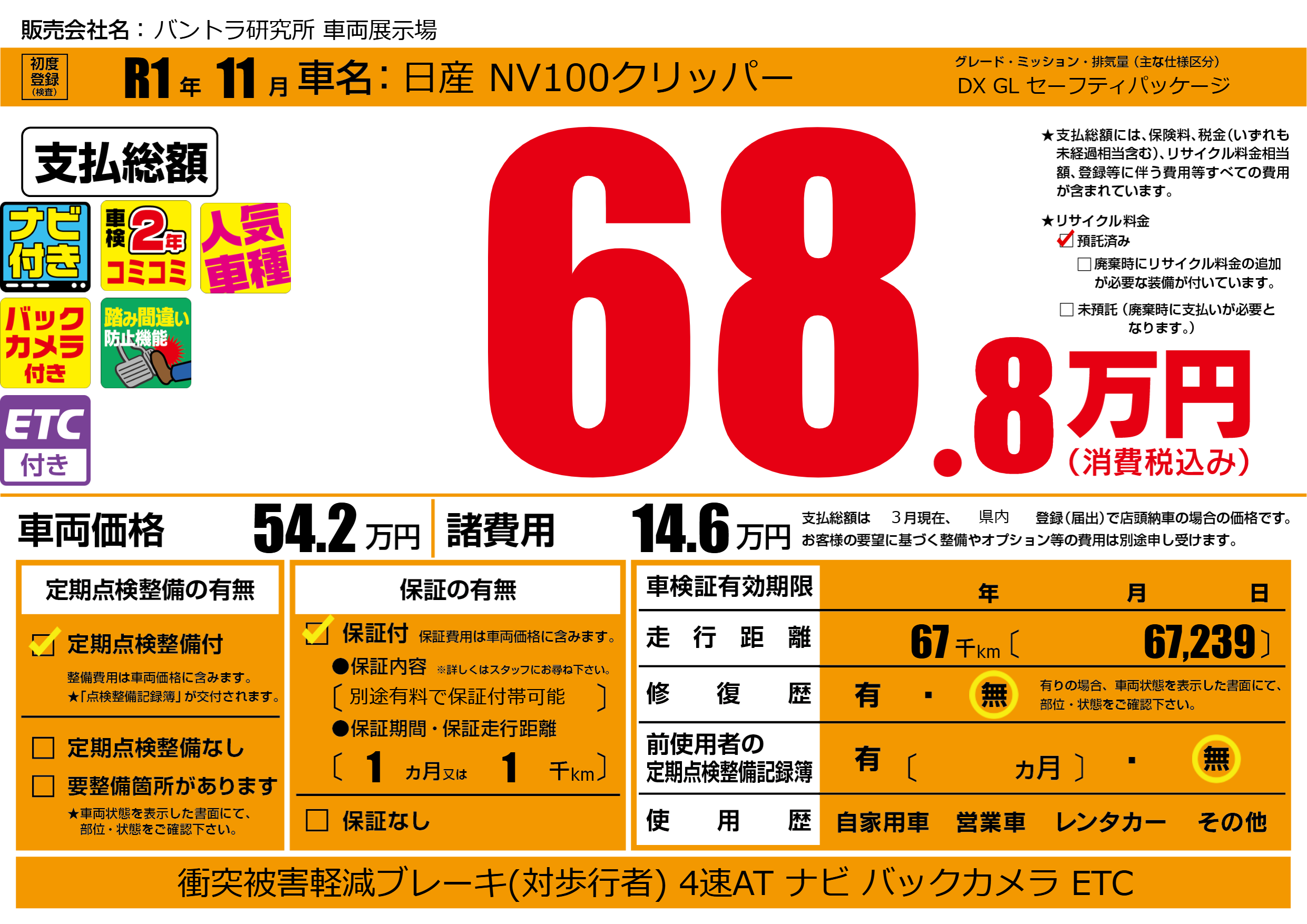 | 車名 | 日産 NV100クリッパー | グレード ミッション 排気量 |