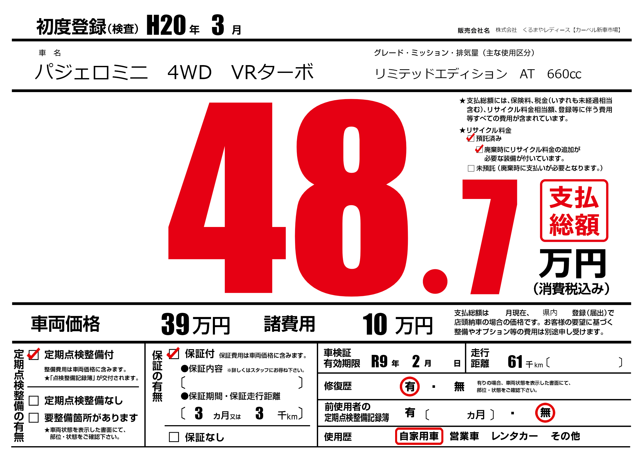 | 車名 | パジェロミニ 4WD VRターボ | グレード ミッション 排気量 |