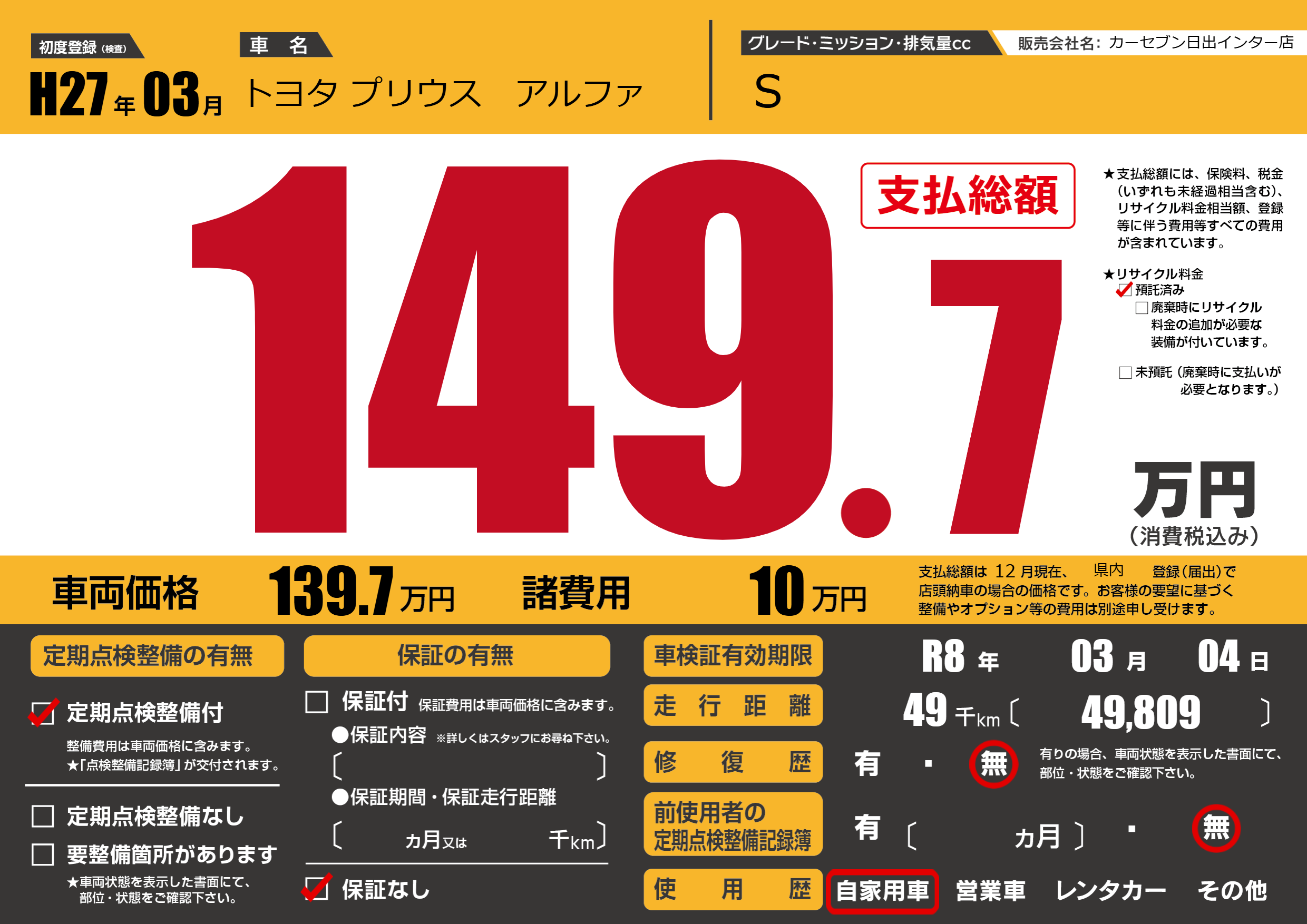 | 走行キロ | 4.9万km | 初年度登録 | H27年03月 |