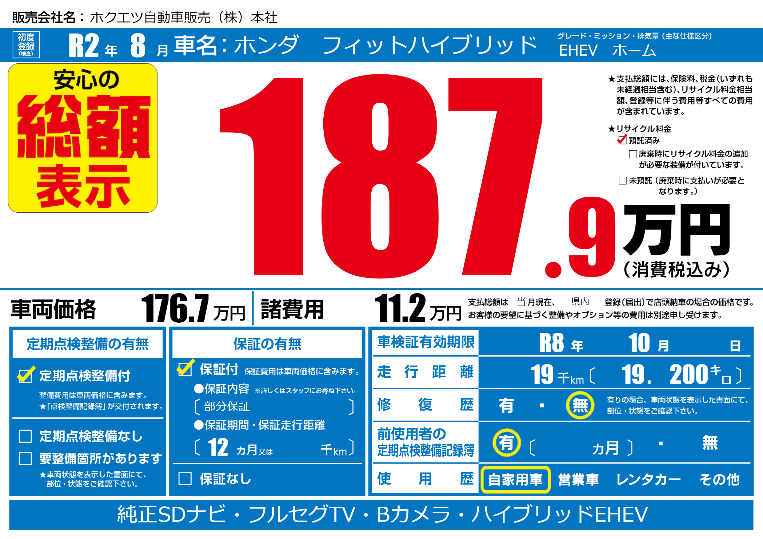 | 車名 | ホンダ フィットハイブリッド | グレード ミッション 排気量 |