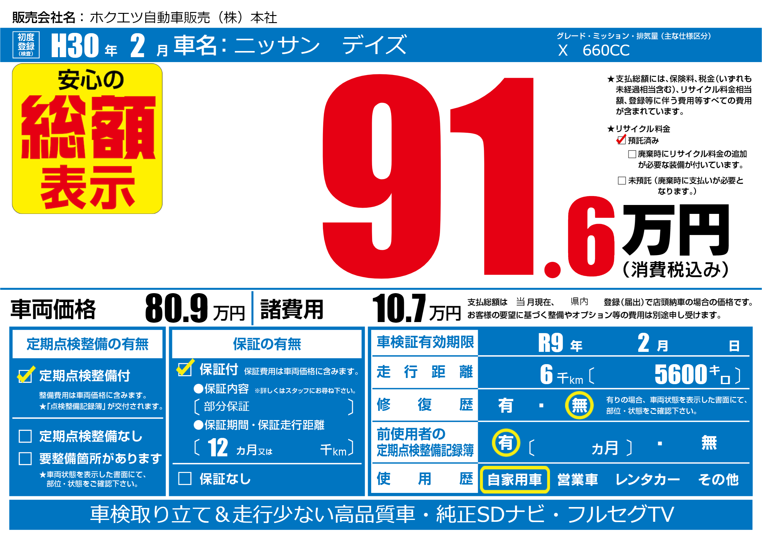 | 車名 | ニッサン デイズ | グレード ミッション 排気量 |