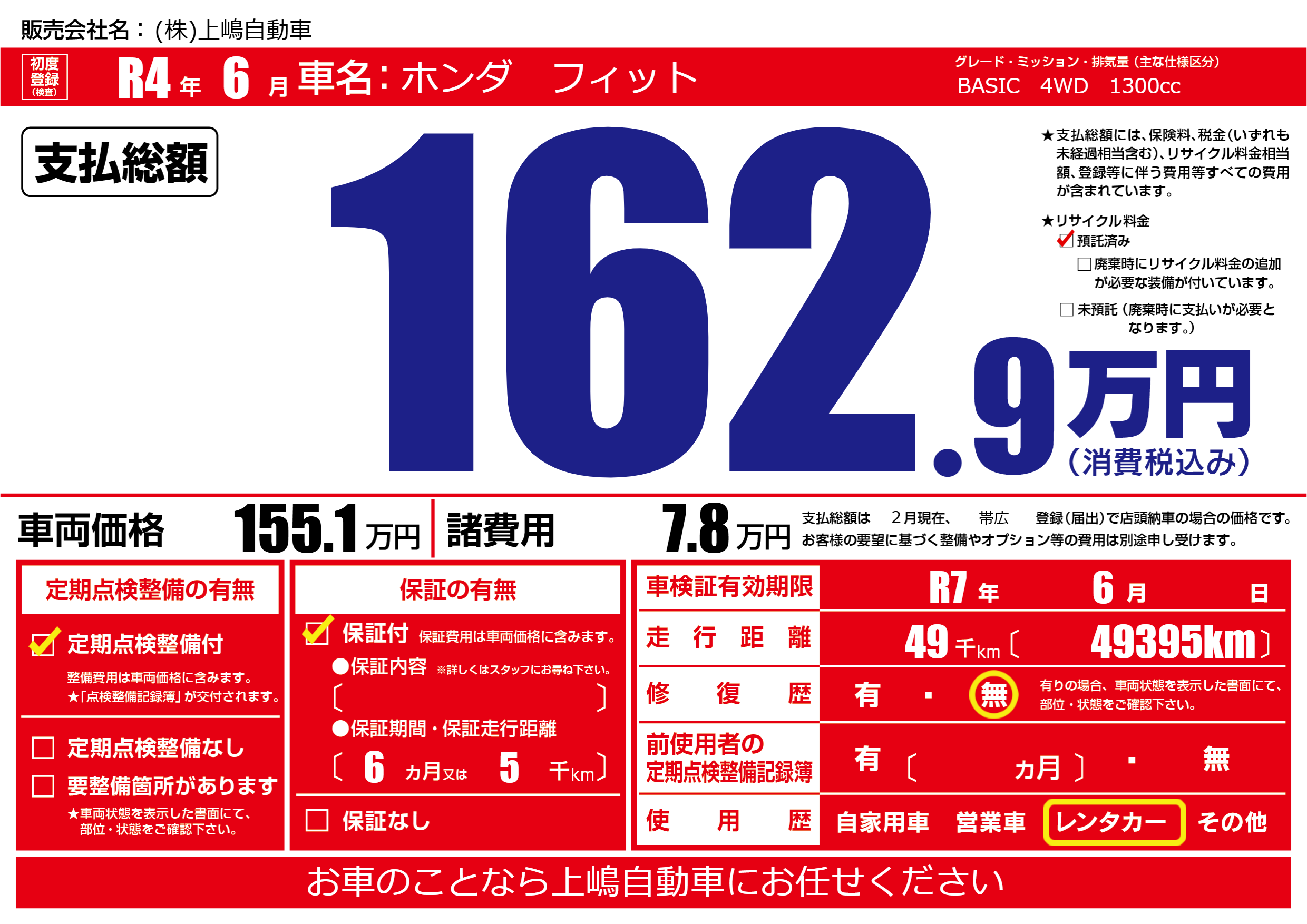 | 車検制限 | R7年 6月 - 日 | ||