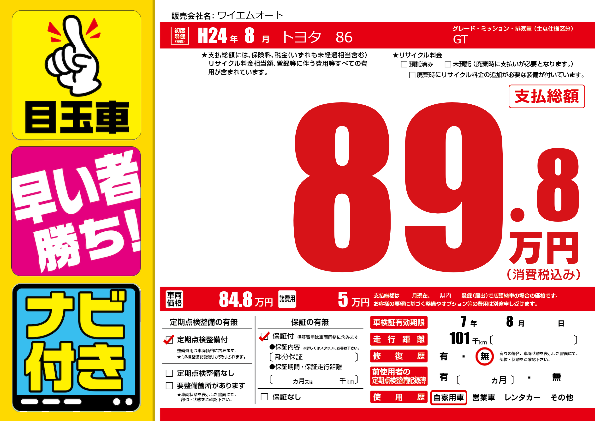 | 車名 | トヨタ 86 | グレード ミッション 排気量 |