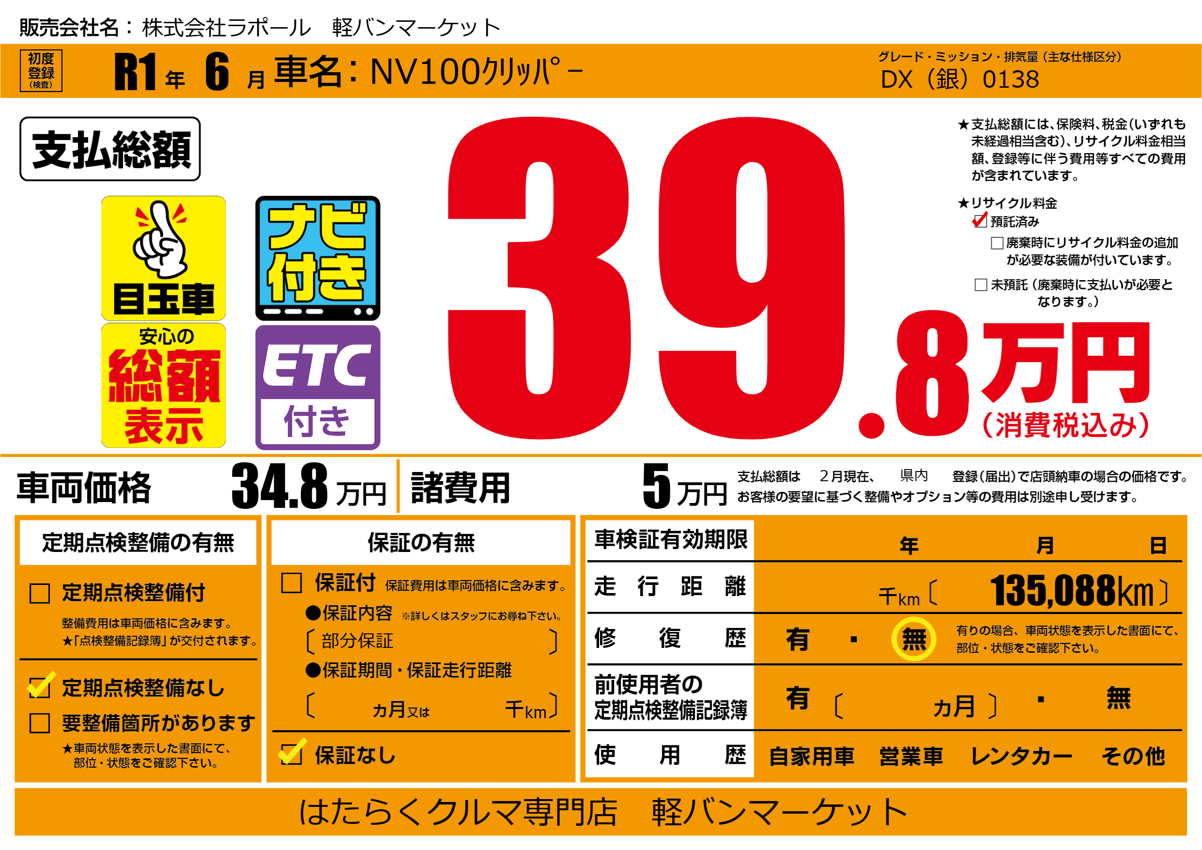 | 車名 | NV100クリッパー | グレード ミッション 排気量 |