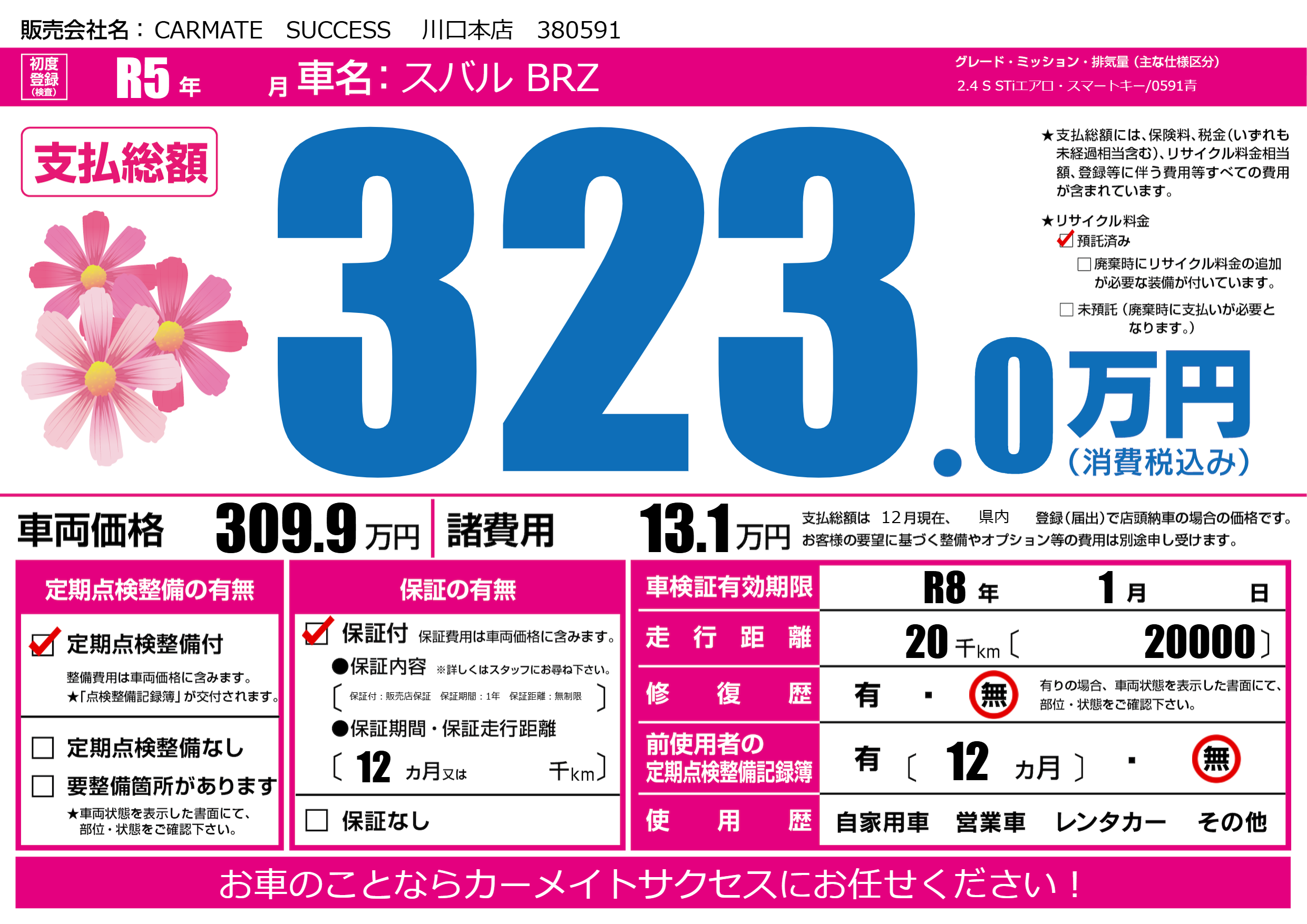 | 車名 | スバル BRZ | グレード ミッション 排気量 |