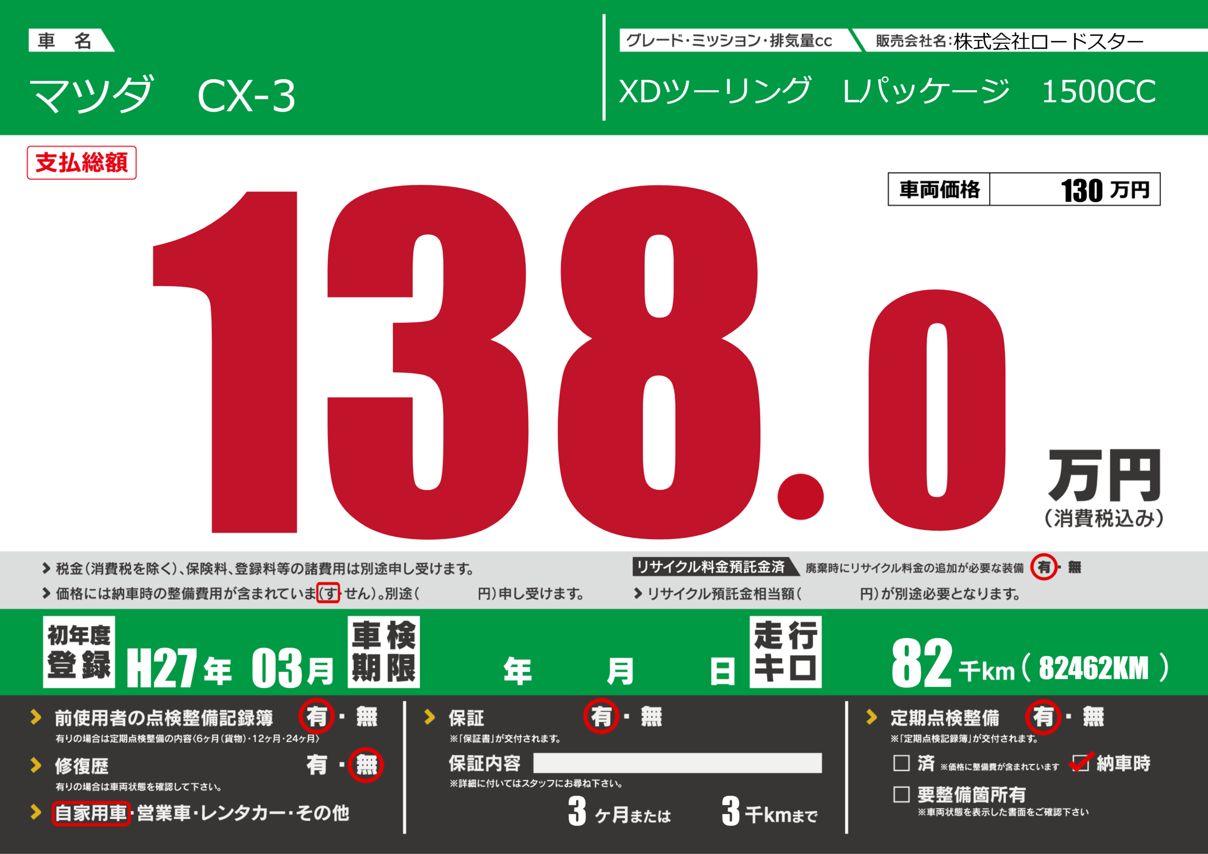 保証付き 保証内容(---) 3ヶ月または(3)千kmまで |
