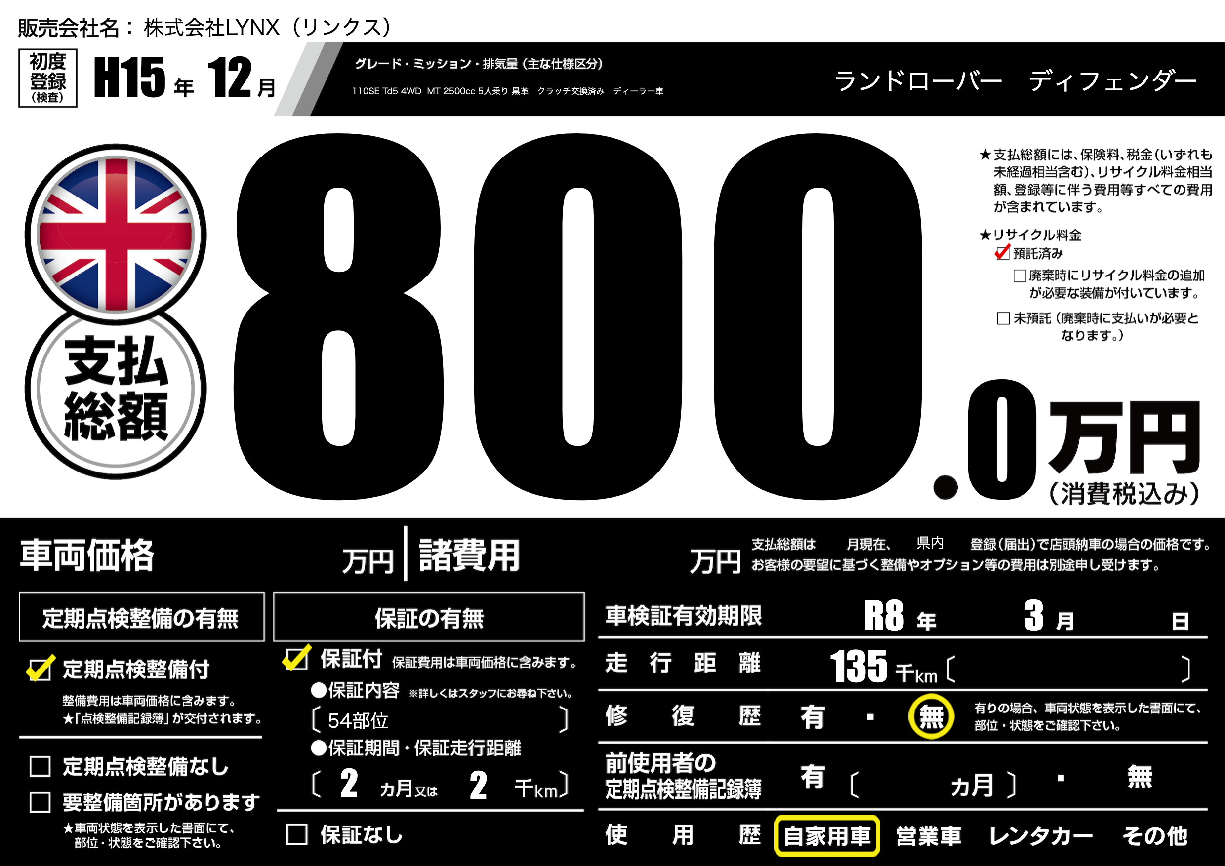 110SE Td5 4WD MT 2500cc 5人乗り 黒革 クラッチ交換済み ディーラー車 |