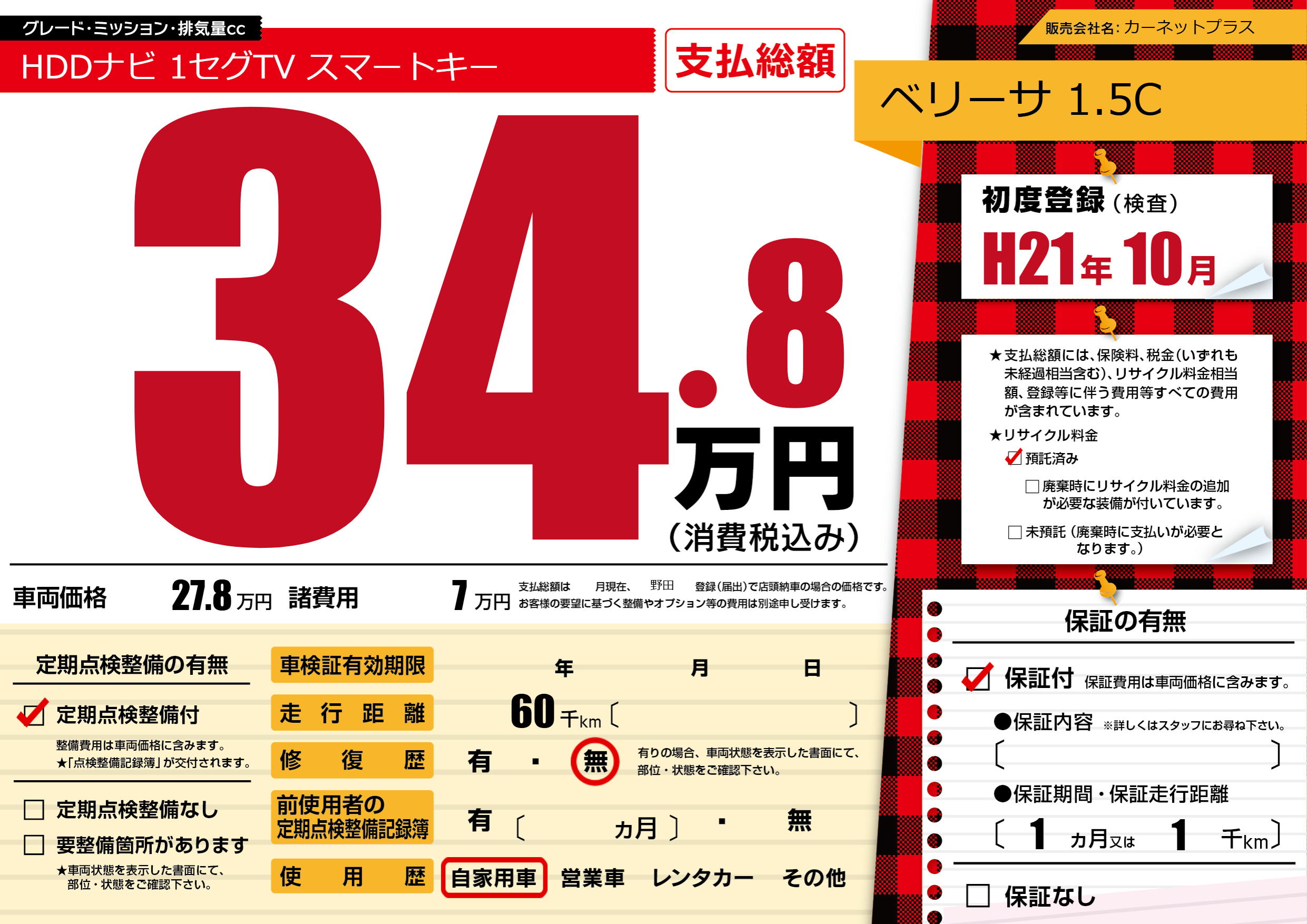 | 車名 | ベリーサ 1.5C | グレード ミッション 排気量 |