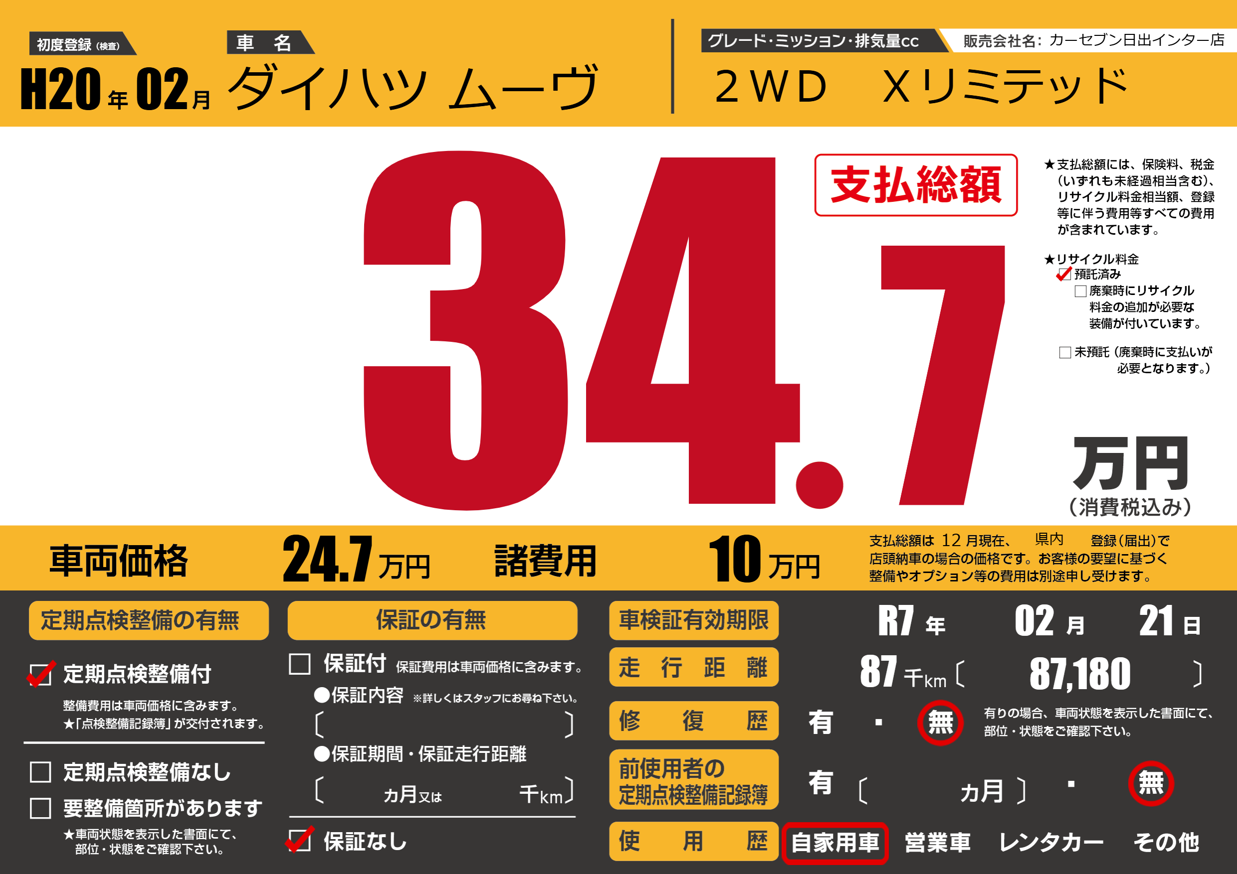 | 走行キロ | 8.7万km | 初年度登録 | H20年02月 |