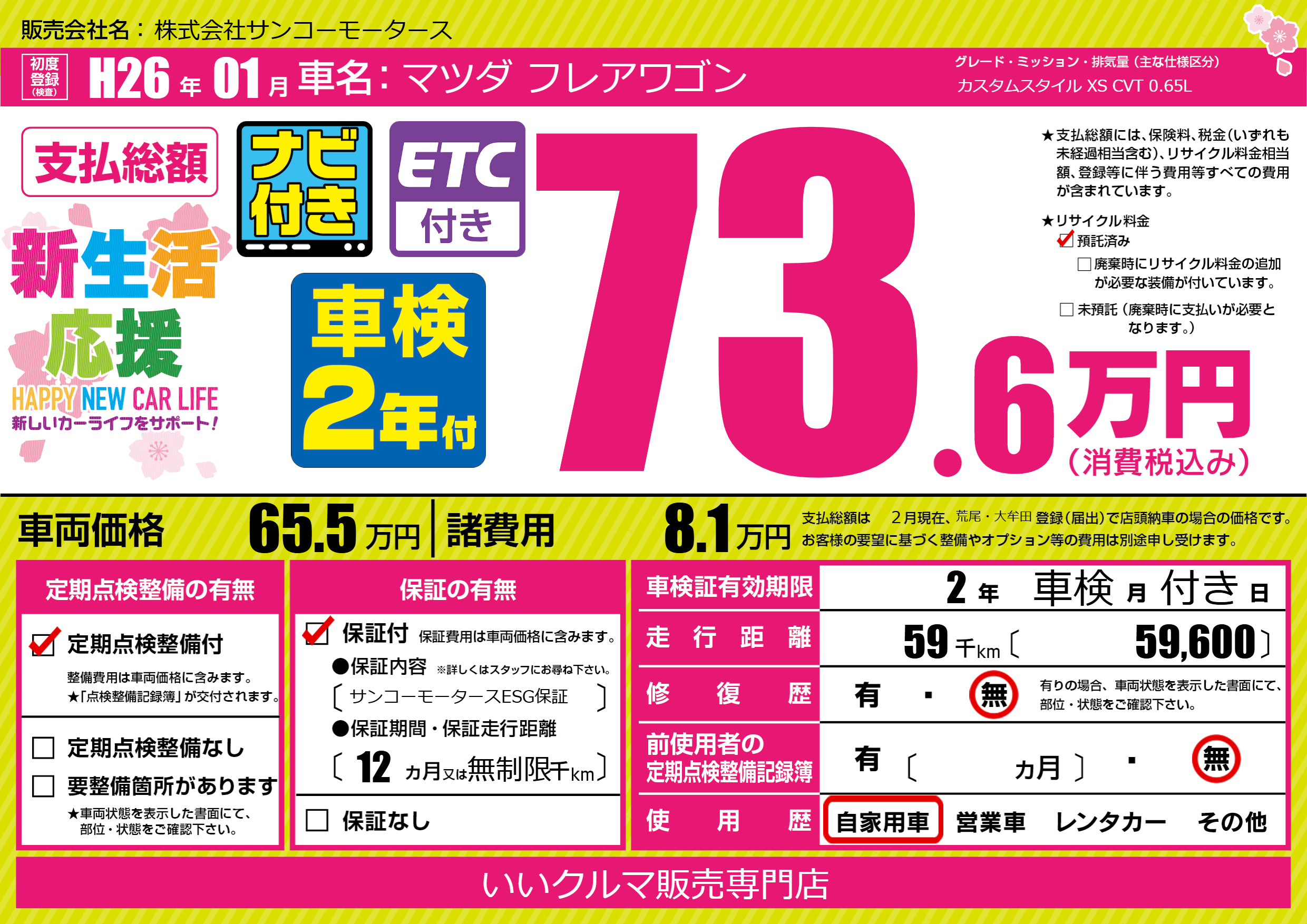 | 車名 | マツダ フレアワゴン | グレード ミッション 排気量 |