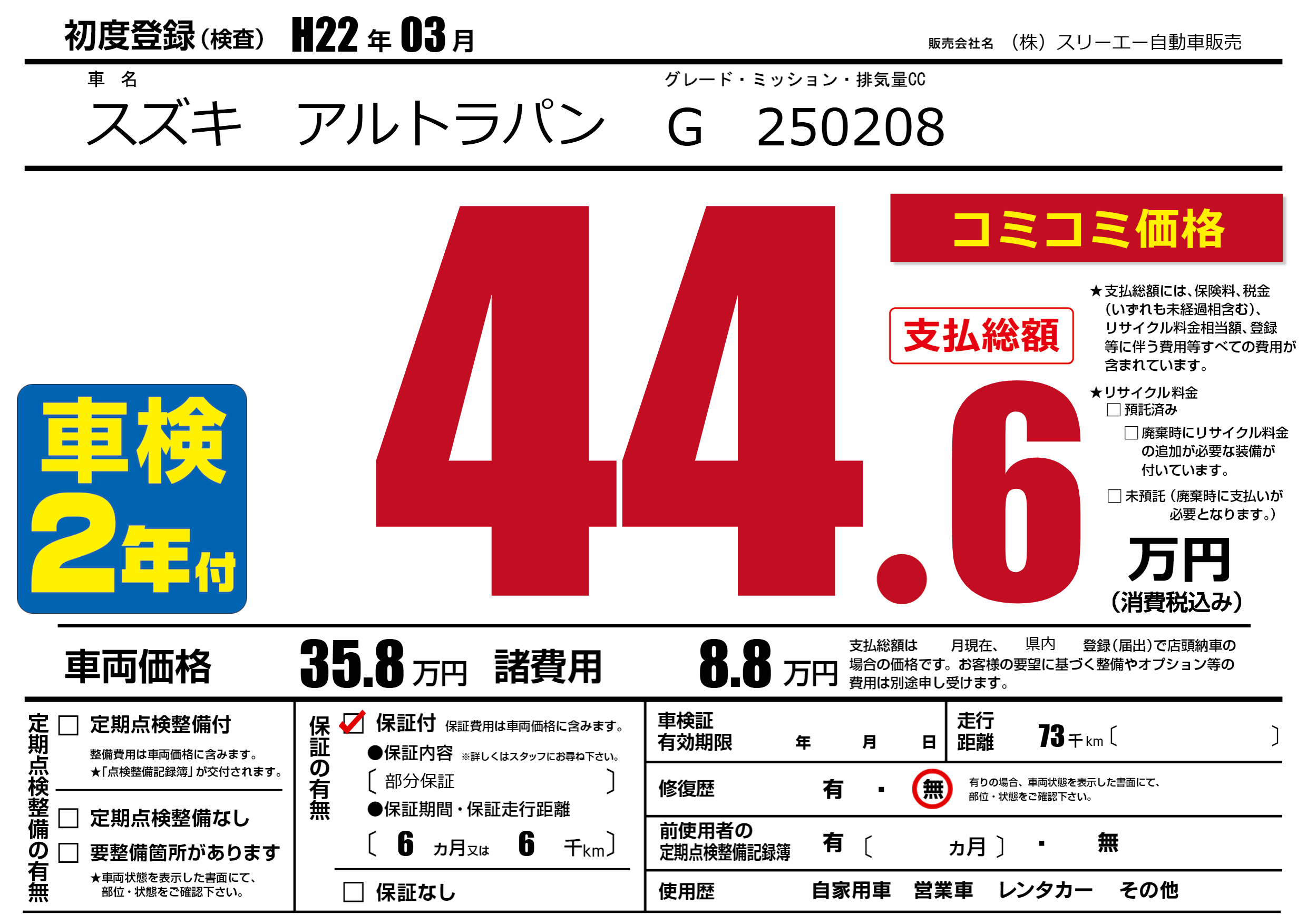 保証付き 保証内容(部分保証) 6ヶ月または(6)千kmまで |