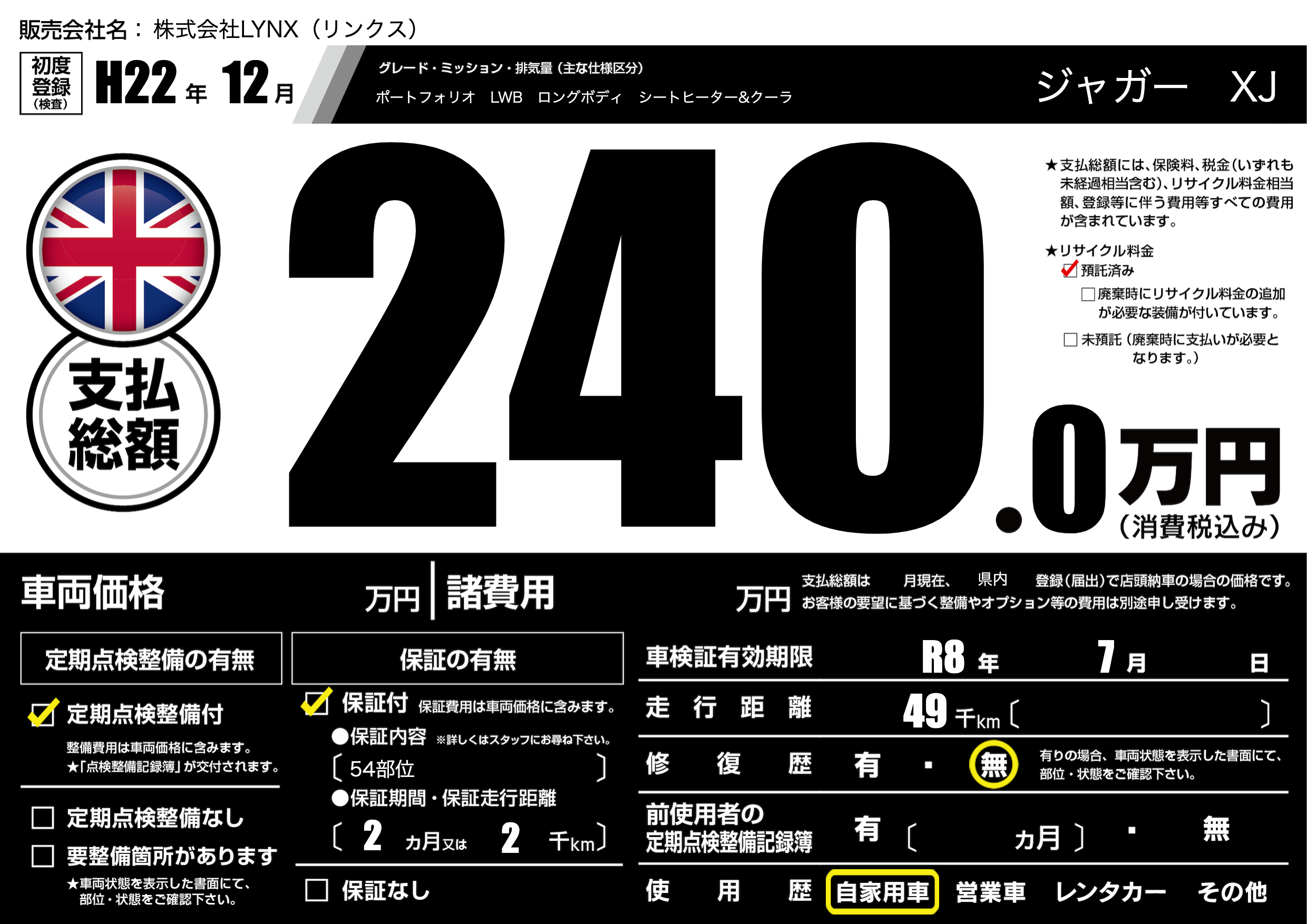 | 車名 | ジャガー XJ | グレード ミッション 排気量 |