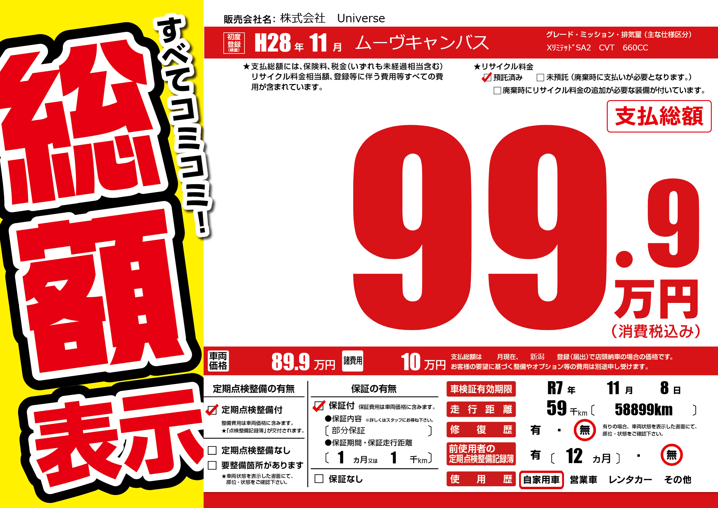 | 車名 | ムーヴキャンバス | グレード ミッション 排気量 |