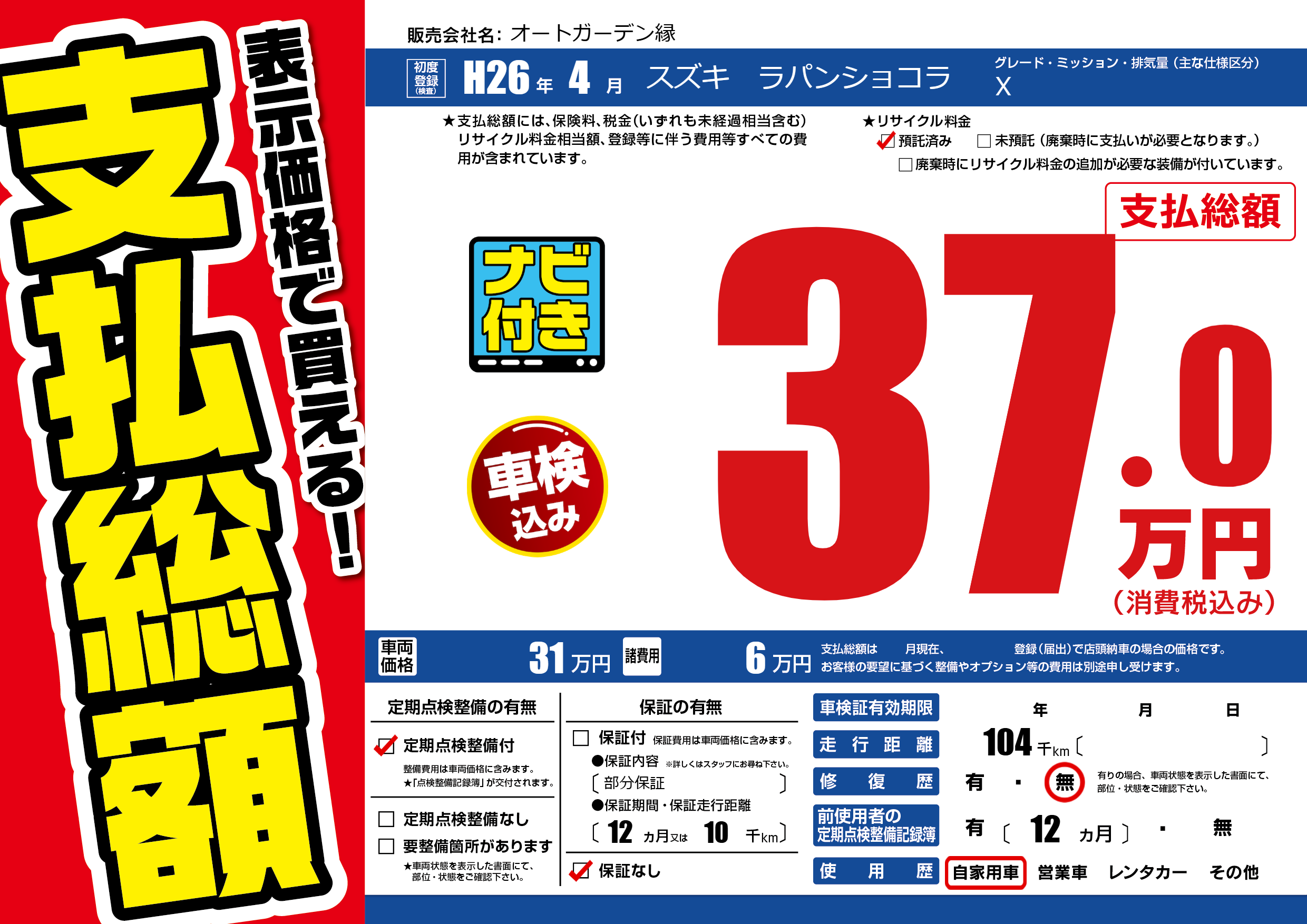 | 車検制限 | - 年 - 月 - 日 | ||