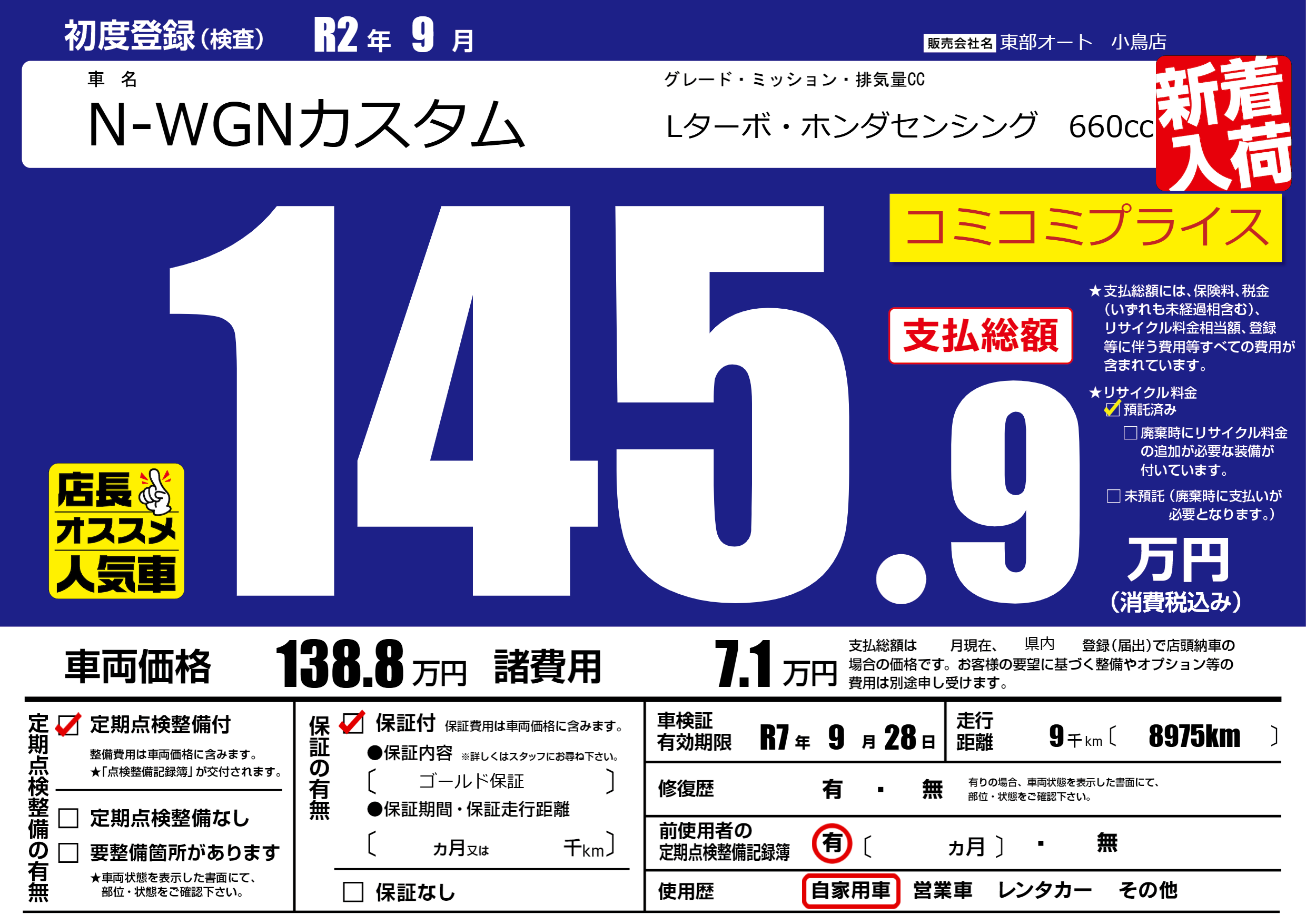 | 走行キロ | 0.9万km | 初年度登録 | R2年9月 |