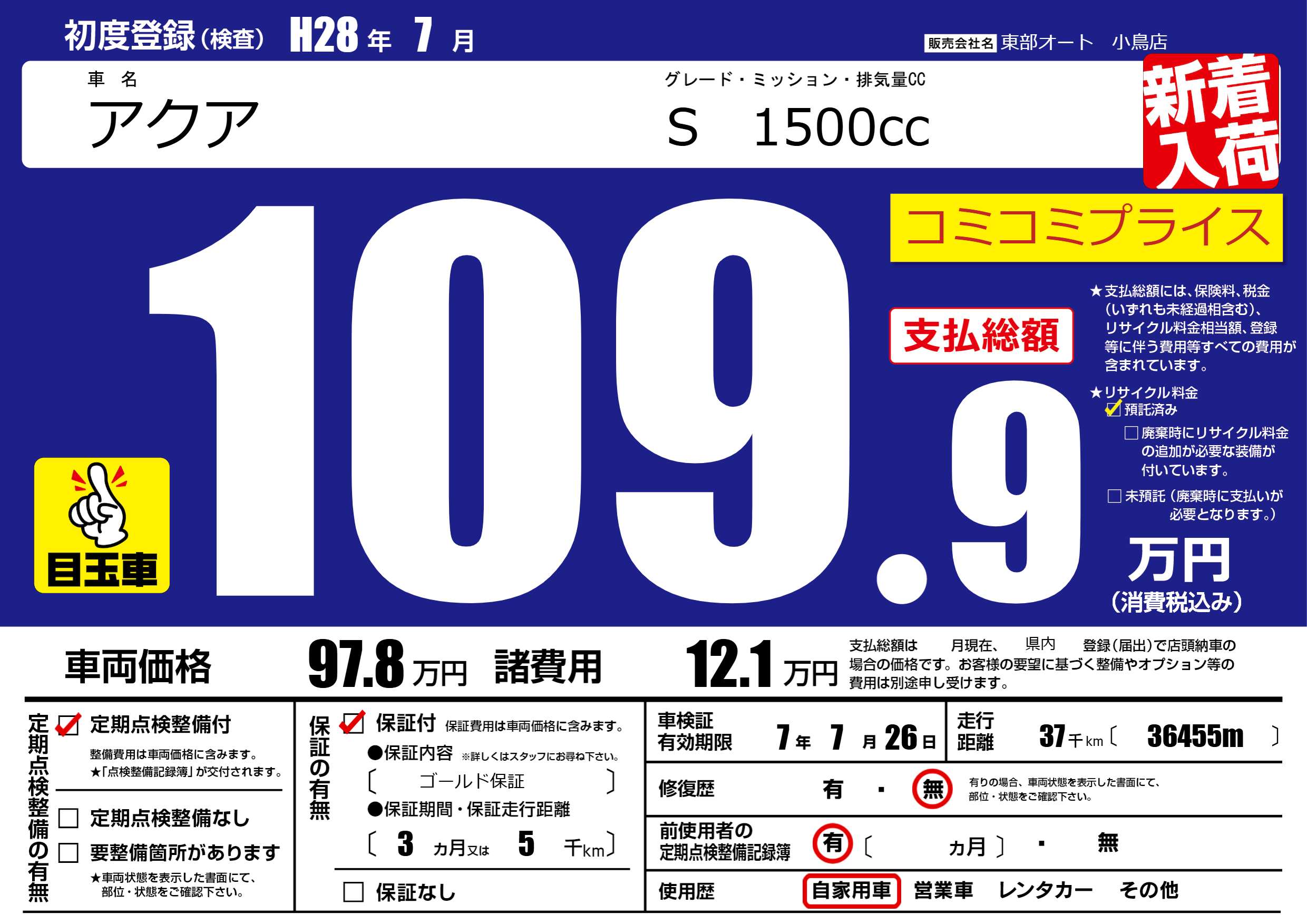 | 走行キロ | 3.7万km | 初年度登録 | H28年7月 |