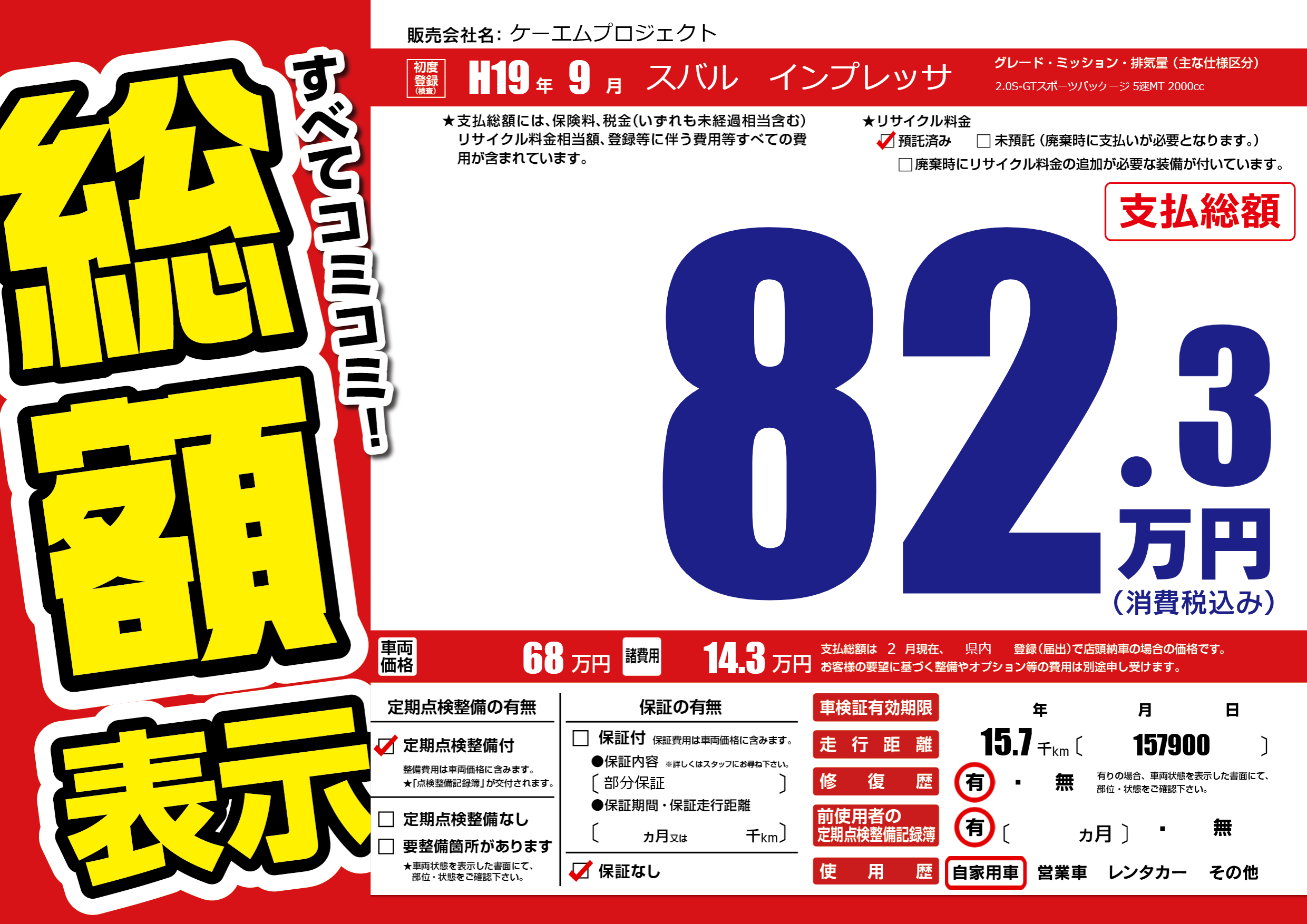 | 車名 | スバル インプレッサ | グレード ミッション 排気量 |