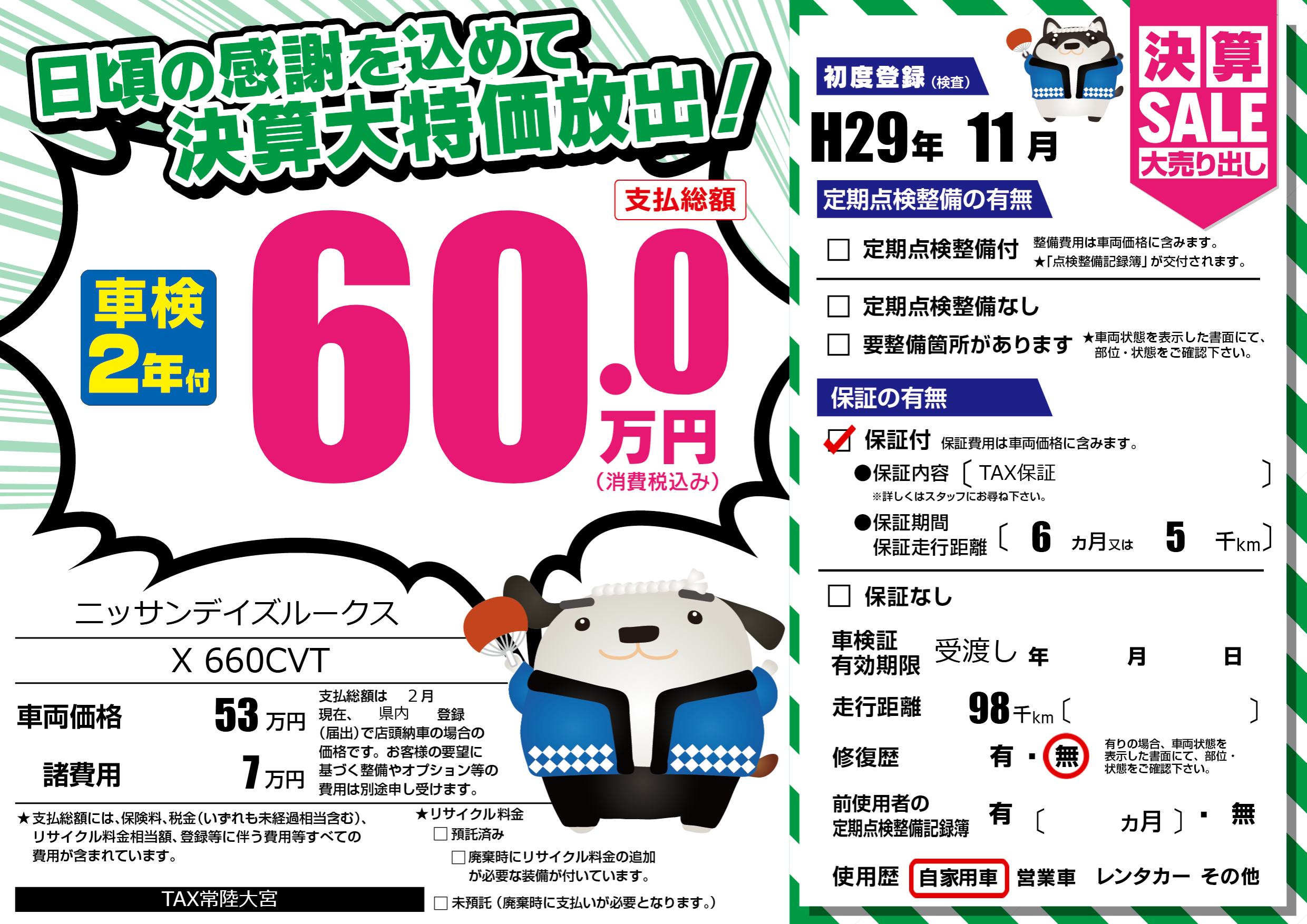 | 車名 | ニッサンデイズルークス | グレード ミッション 排気量 |