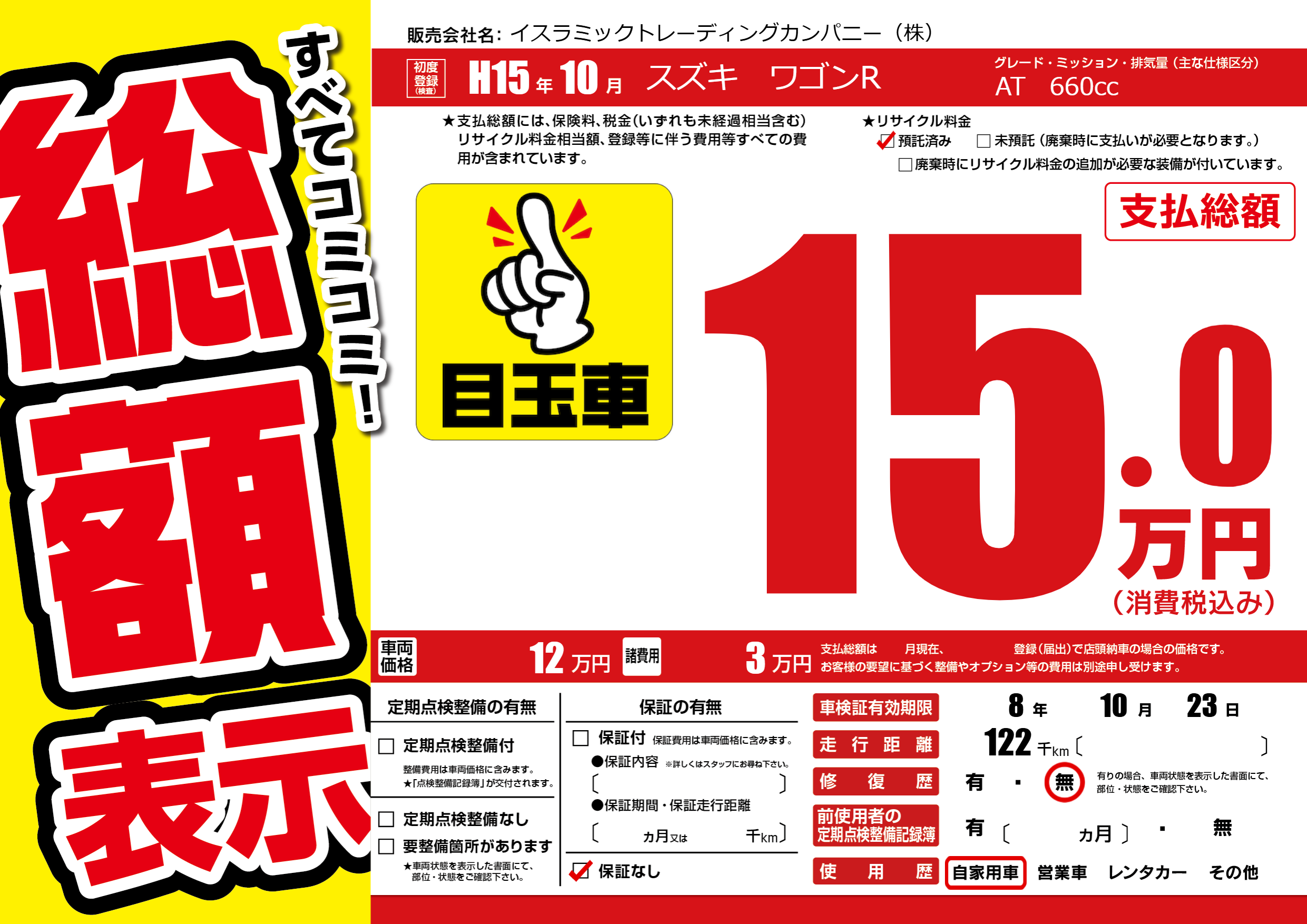 | 走行キロ | 12.2万km | 初年度登録 | H15年10月 |