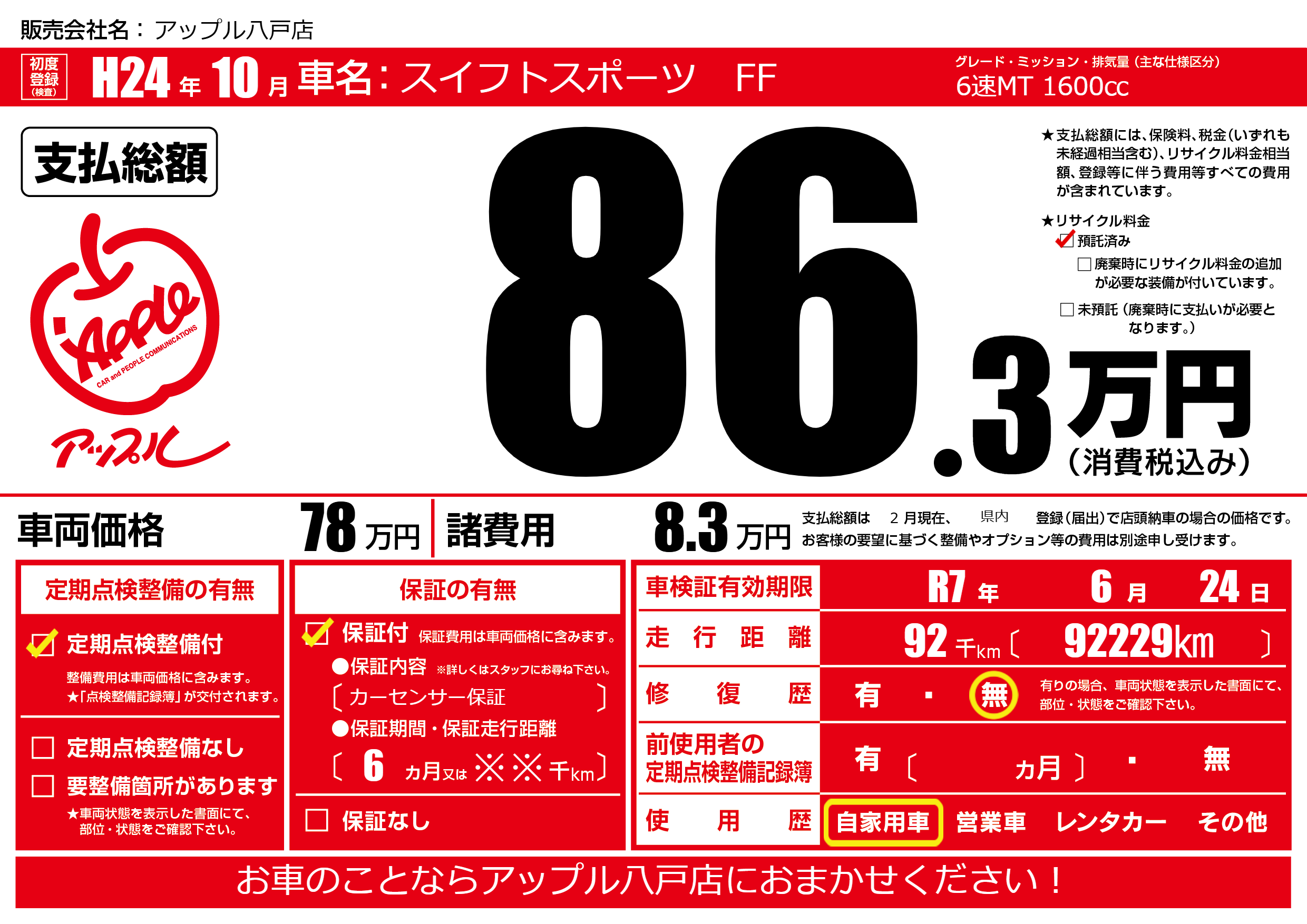 | 車名 | スイフトスポーツ FF | グレード ミッション 排気量 |
