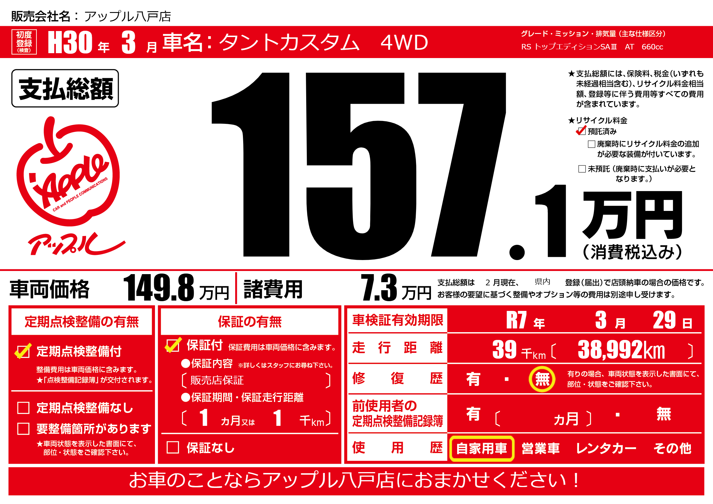 | 走行キロ | 3.9万km | 初年度登録 | H30年3月 |