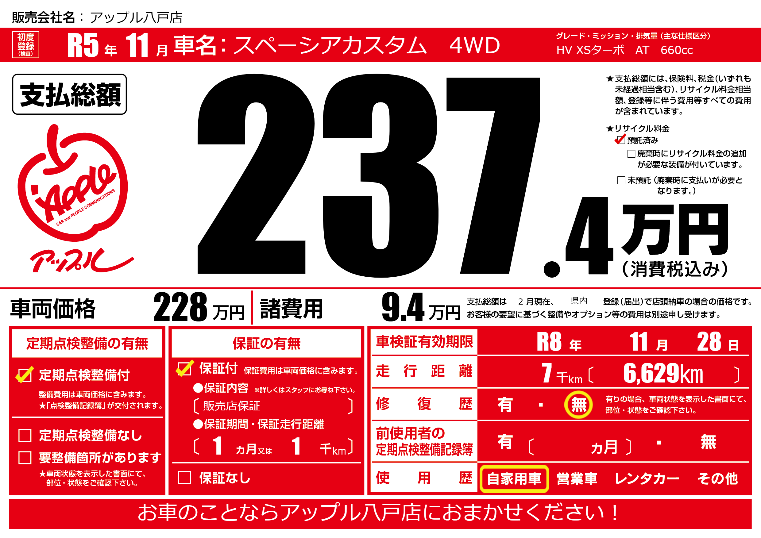 | 車名 | スペーシアカスタム 4WD | グレード ミッション 排気量 |
