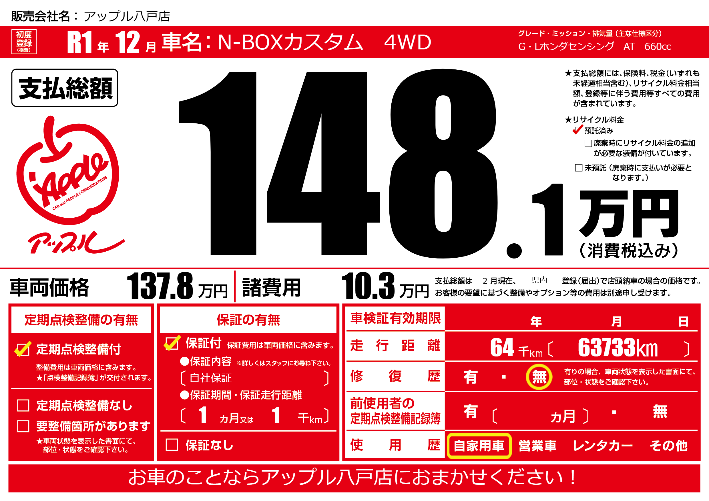 | 車名 | N-BOXカスタム 4WD | グレード ミッション 排気量 |