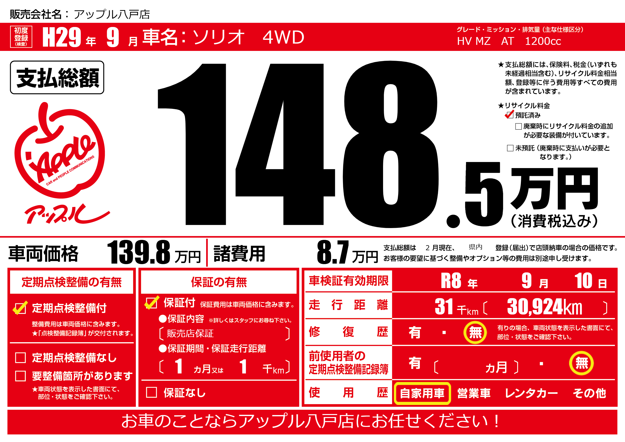 | 走行キロ | 3.1万km | 初年度登録 | H29年9月 |