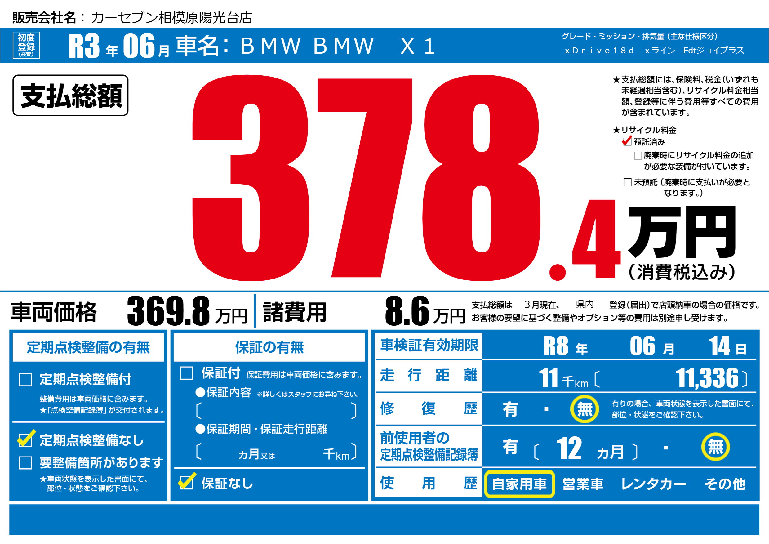 | 車名 | BMW BMW X1 | グレード ミッション 排気量 |