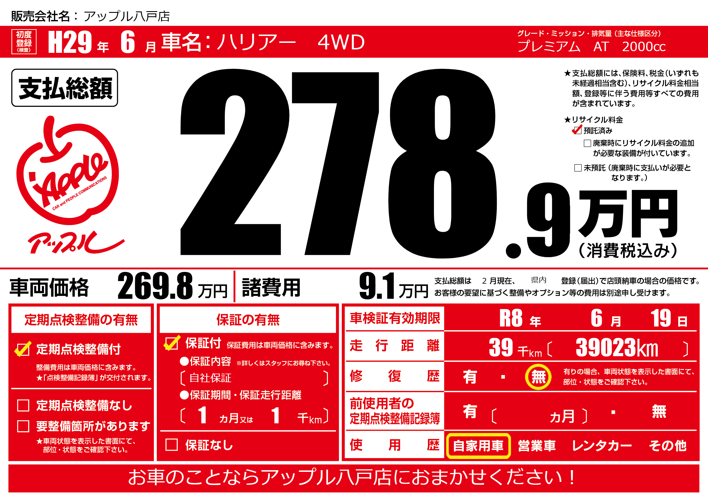 | 走行キロ | 3.9万km | 初年度登録 | H29年6月 |