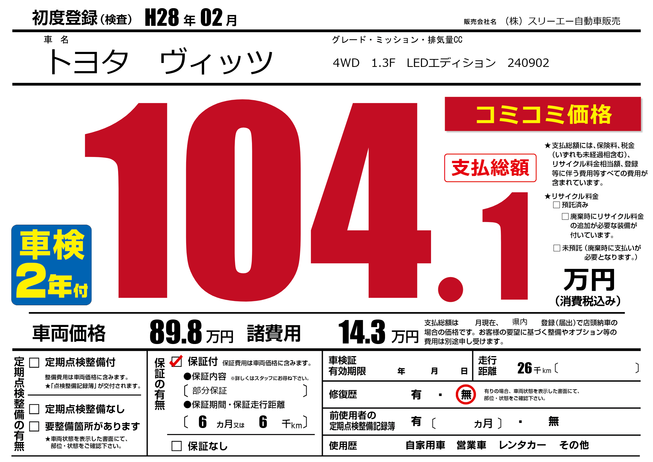 | 走行キロ | 2.6万km | 初年度登録 | H28年02月 |