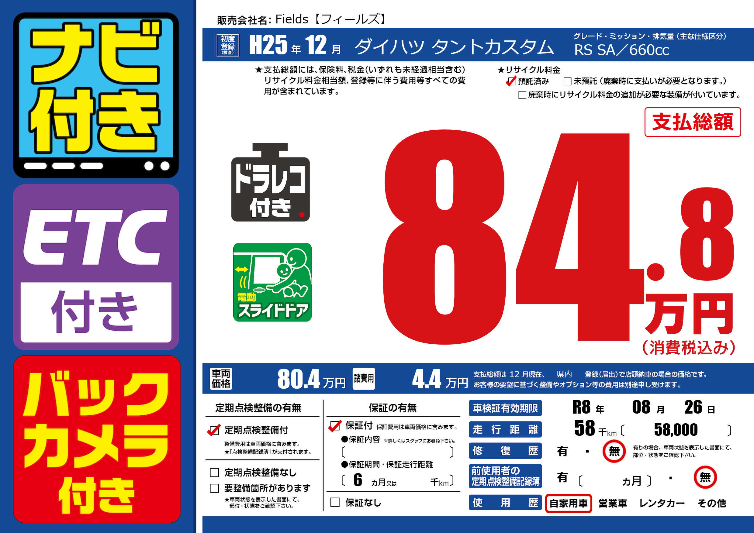 | 走行キロ | 5.8万km | 初年度登録 | H25年12月 |